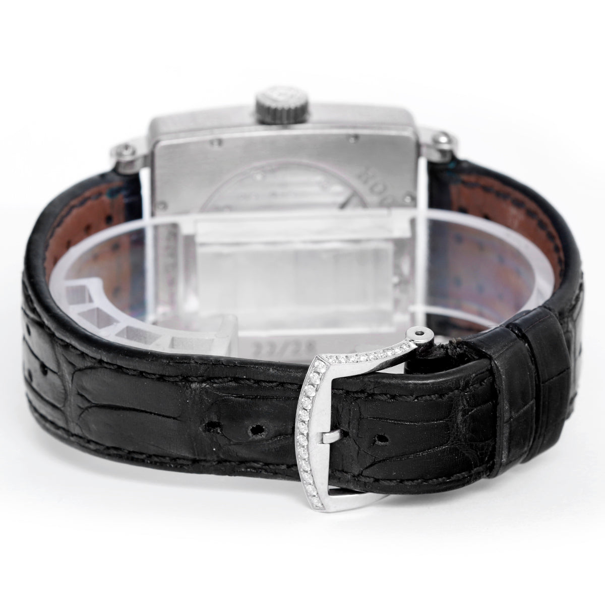 Roger Dubuis Midsize "Golden Square" Watch - Manual Winding with 19 Jewels. 18k White Gold square curved case with Roger Dubuis Diamond bezel and case lugs and exposition back to view movement ( 34 x 44mm). Black Dial with Roman numerals. Black alligator strap with 18K White Gold Roger Dubuis Diamond buckle. Pre-owned with Roger Dubuis box included. Water Resistant at 3 ATM.