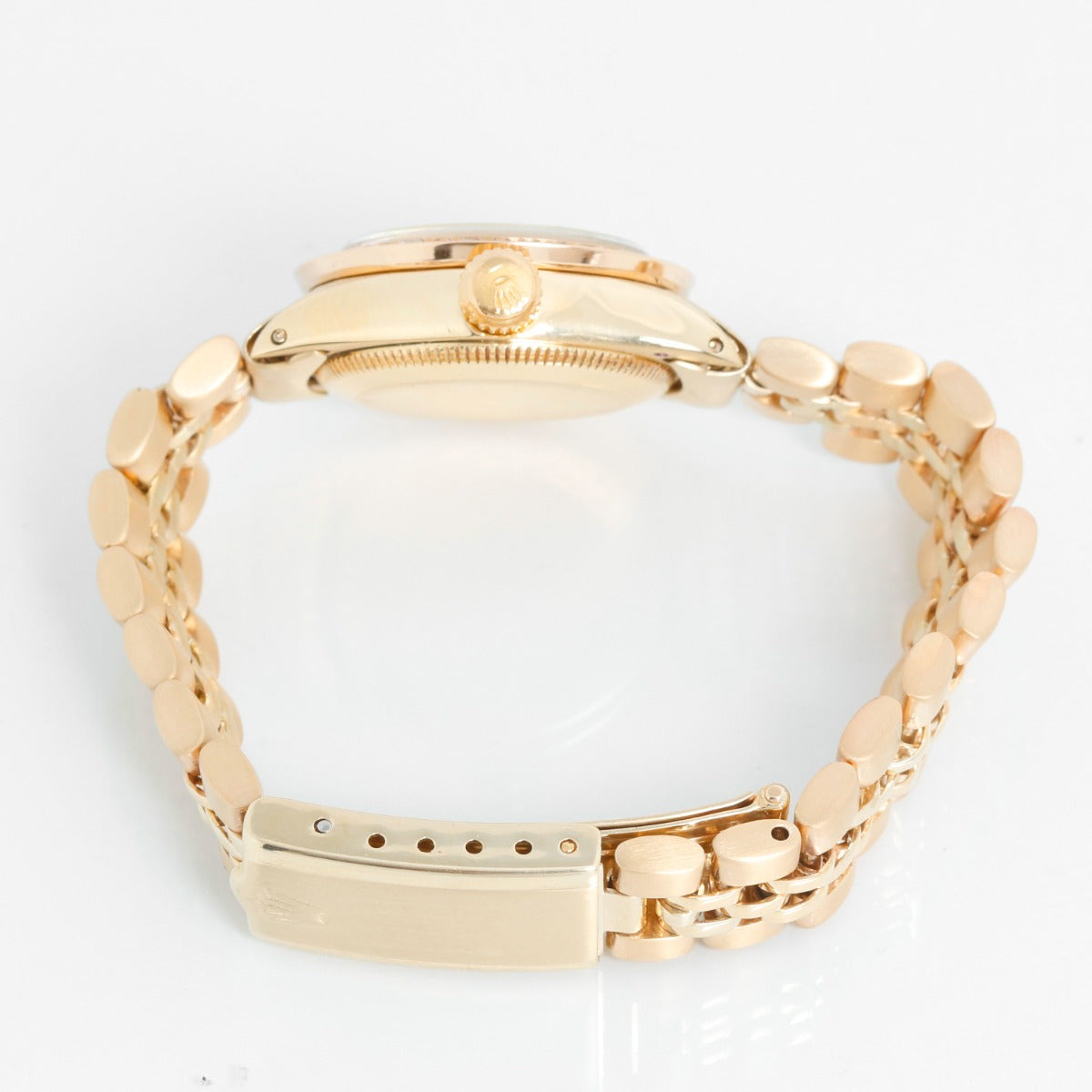 Rolex Ladies Oyster Perpetual Gold Watch 6719 - Automatic winding, acrylic crystal, no-date. 14k gold case with custom diamond bezel (26mm diameter). Custom Mother of pearl diamond dial. Rolex 14k gold bracelet; measures a 5 3/4 inch wrist. Pre-owned with custom box.