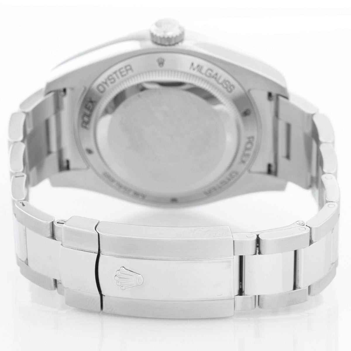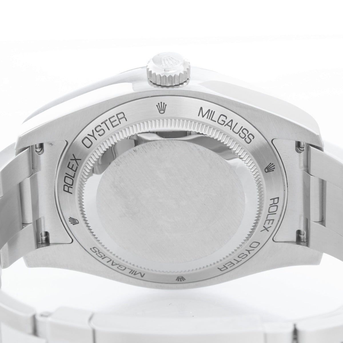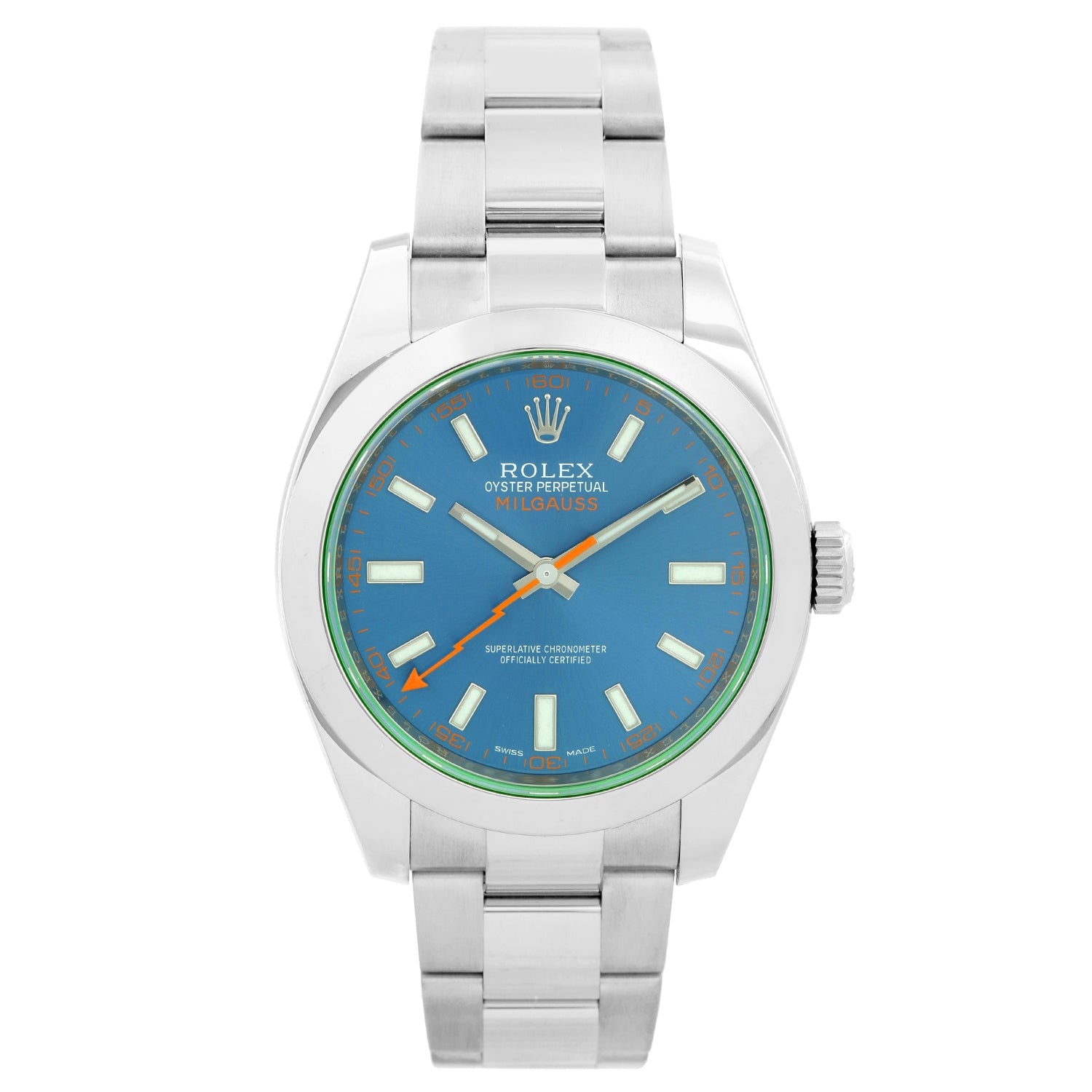 Rolex Green Milgauss Green Crystal Anniversary Model 116400 GV - Automatic winding, green sapphire crystal, 31 jewels. Stainless steel case with smooth bezel (40mm diameter). Blue dial with luminous style and orange markers. Stainless steel Oyster bracelet with flip-lock clasp. Pre-owned with Rolex travel box and books.
