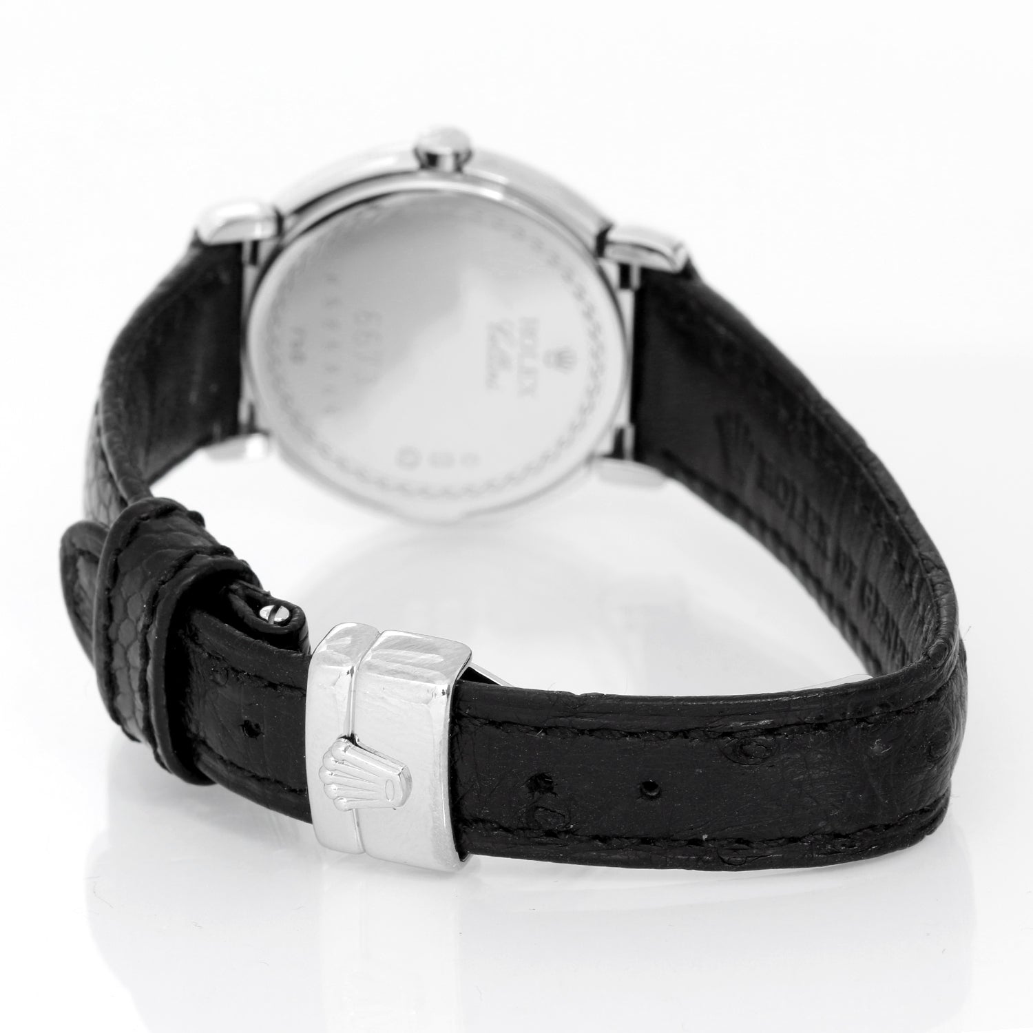 Rolex Cellini Cellissima Ladies Silver -Rose Dial 6673/9 - Quartz 8 jewel movement; sapphire crystal. 18k white gold case (31mm diameter) with 240 Rolex diamond bezel. Silver-Light Rose dialwith gold Roman numerals. black ostrich strap with 18K White gold Rolex deployant clasp. Pre-owned with Rolex box and books.
