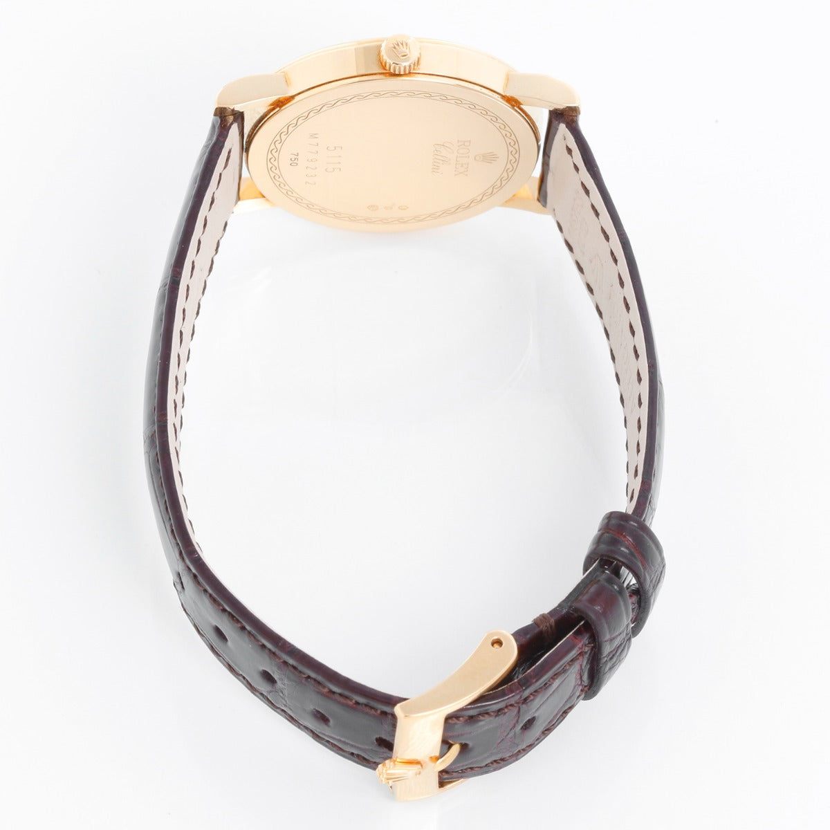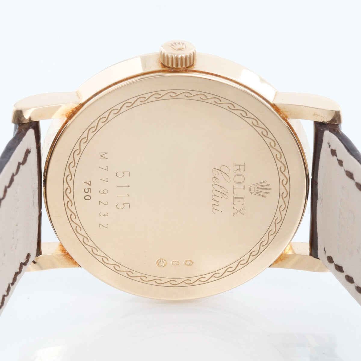 Rolex Cellini Classic 18k Yellow Gold Men's Watch 5115 - Manual winding. 18k yellow gold case (32 mm). Cream jubilee dial with Roman numerals. Brown Rolex strap band with 18k yellow gold Rolex buckle. Pre-owned with custom box.