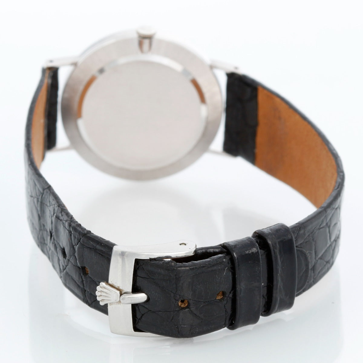 Rolex Cellini Men's 18k White Gold Watch on Strap Band Mod. 4112 - Manual winding. 18k white gold case (32mm diameter). Blue sunburst dial. Black strap with Rolex tang buckle. Pre-owned with custom box .