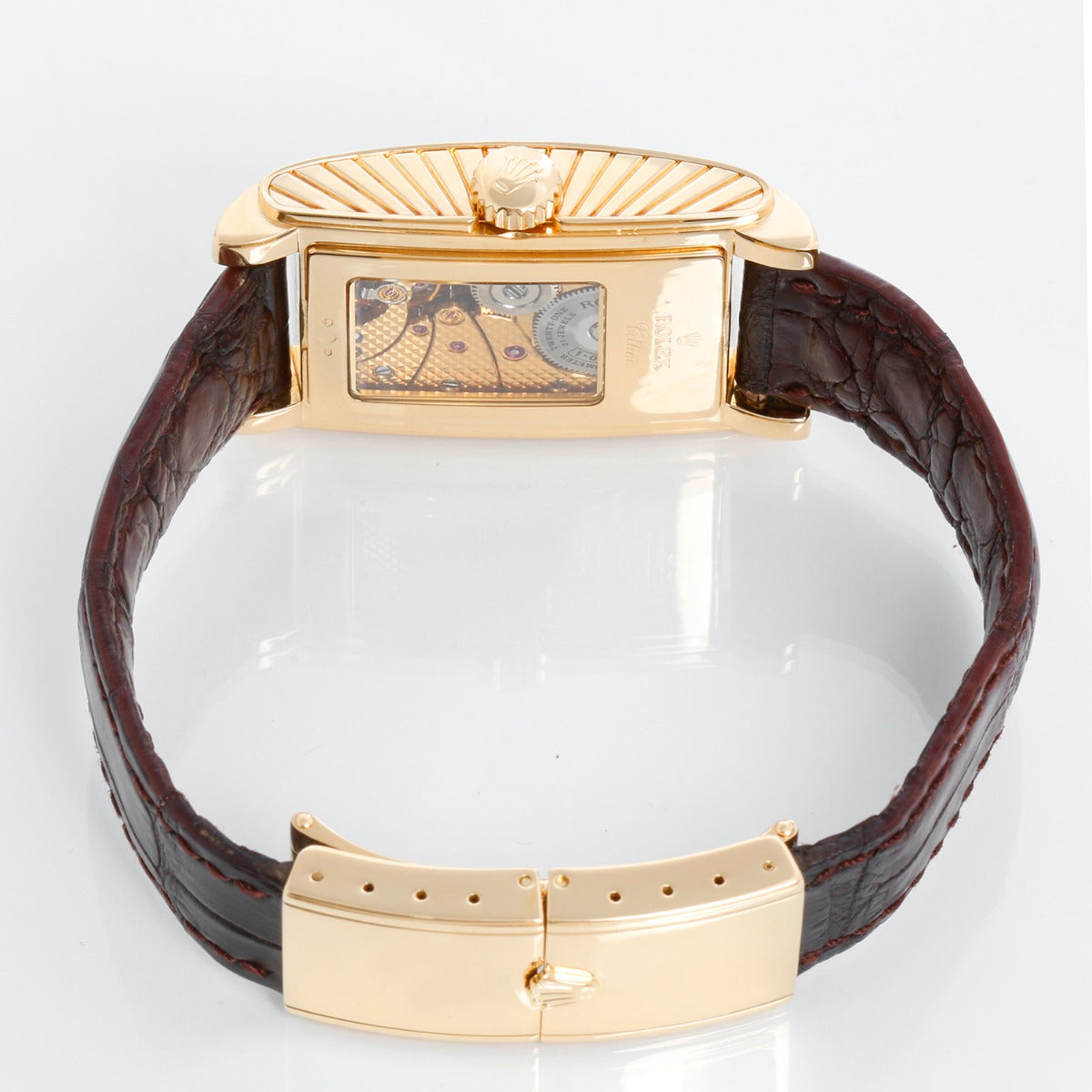 Rolex Prince Cellini Men's 18k Yellow Gold Watch 5440/8 - Manual winding. 18k yellow gold case with exposition back ( 28 mm x 48 mm ). Gold textured dial and round ivory colored hour/minutes dial with Roman numeral markers and seconds subdial below. Brown strap band with 18k yellow gold deployant clasp. Pre-owned with Rolex box .