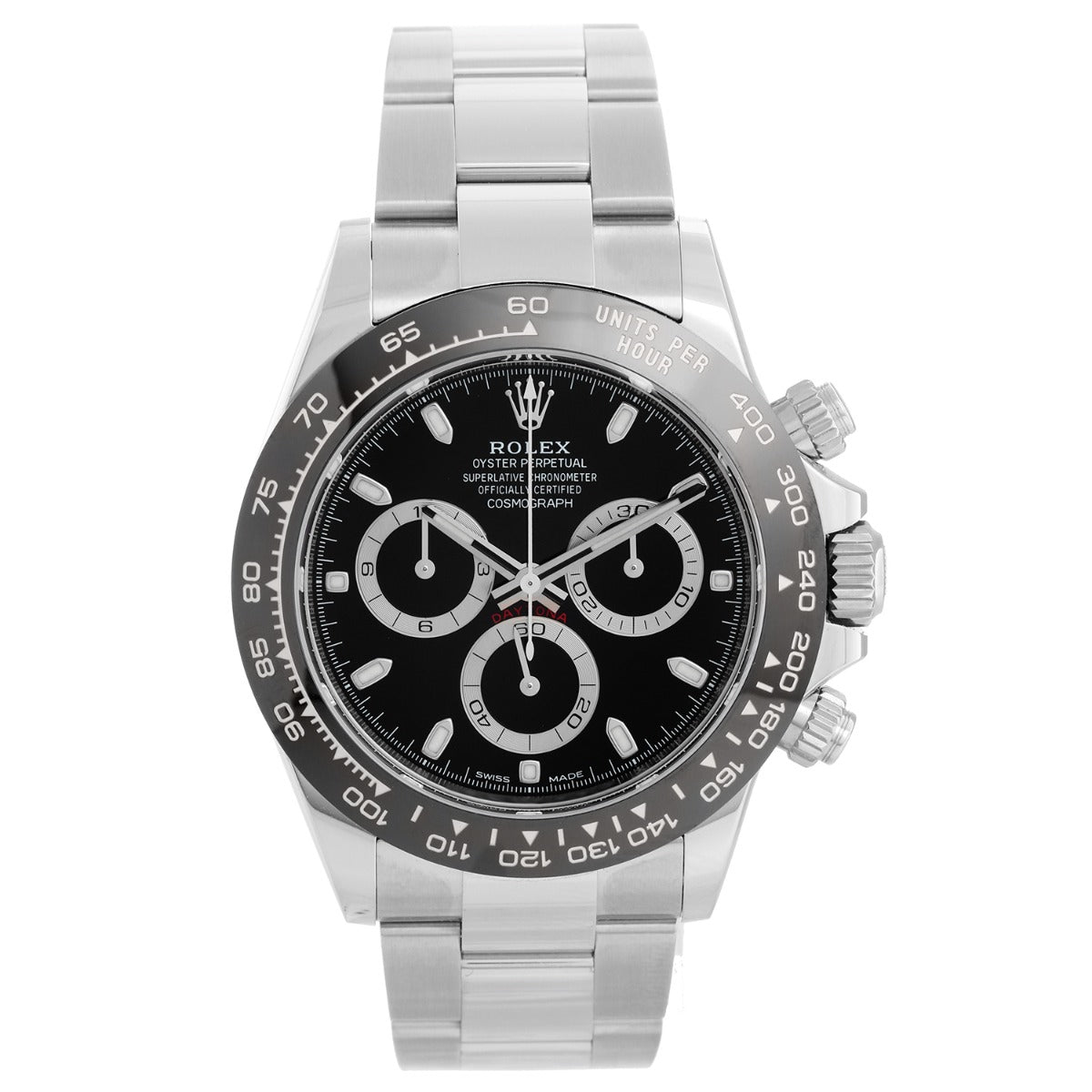 Rolex Daytona Chronograph Function Men's Stainless Steel Watch 116500 - Automatic winding, chronograph, 44 jewels, sapphire crystal. Stainless steel case (40mm diameter). Balck dial with luminous hour markers; hour, minute and seconds recorders. Stainless steel Oyster bracelet with flip-lock clasp. Pre-owned with box and Rolex card