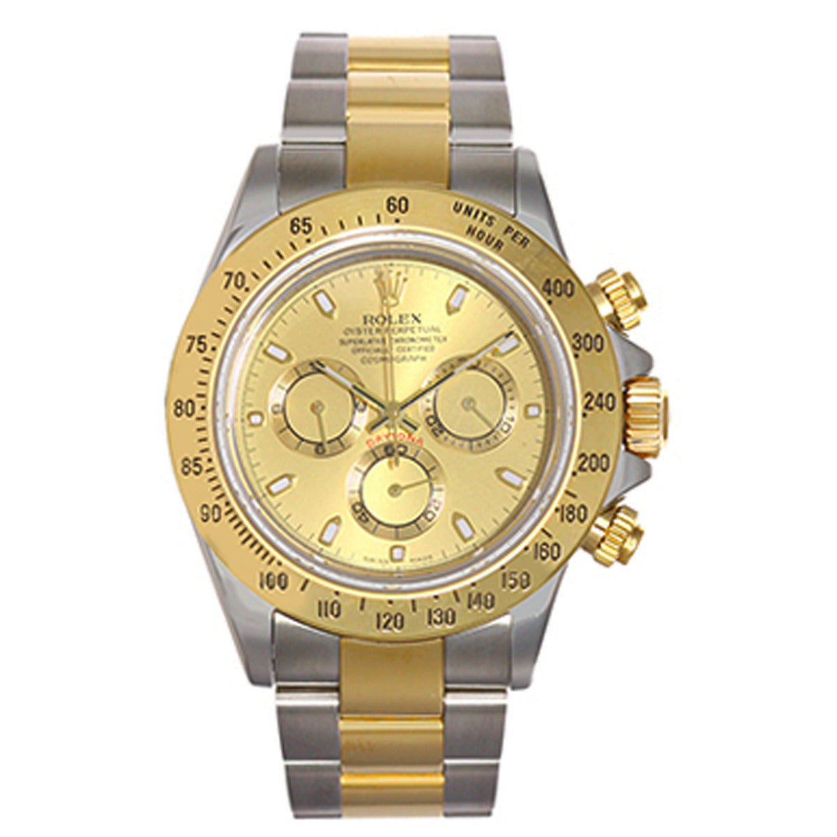Rolex Daytona, Model 116523 - Men's stainless steel and 18k yellow gold automatic-winding chronograph wristwatch (40mm diameter). Champagne dial with luminous markers. Stainless steel and 18k yellow gold Oyster bracelet with flip-lock clasp. Unused with Rolex box and papers.