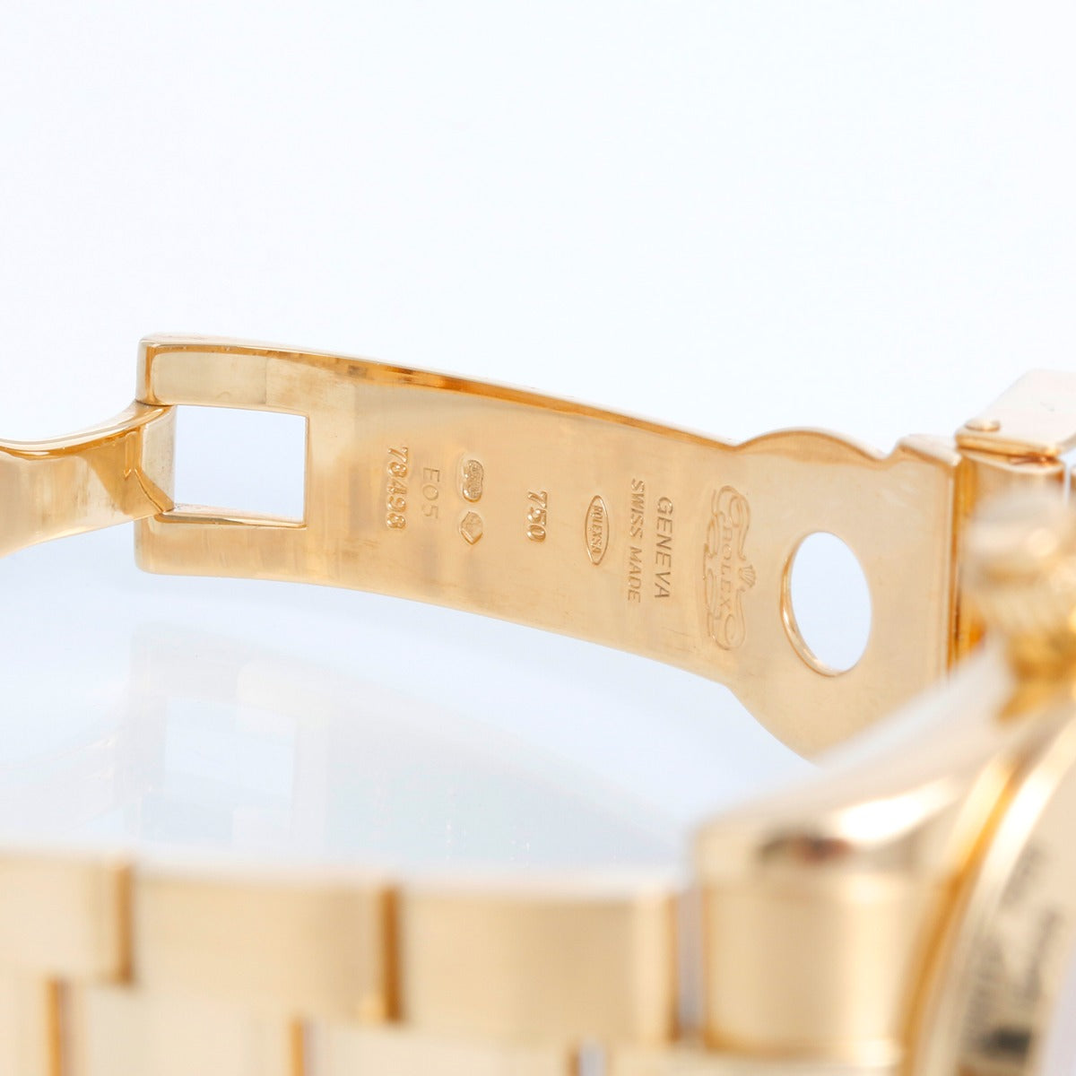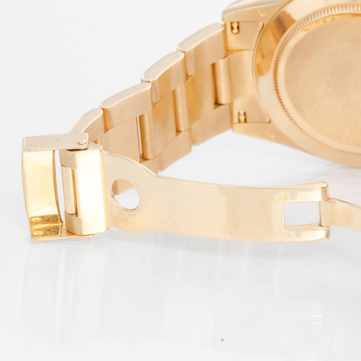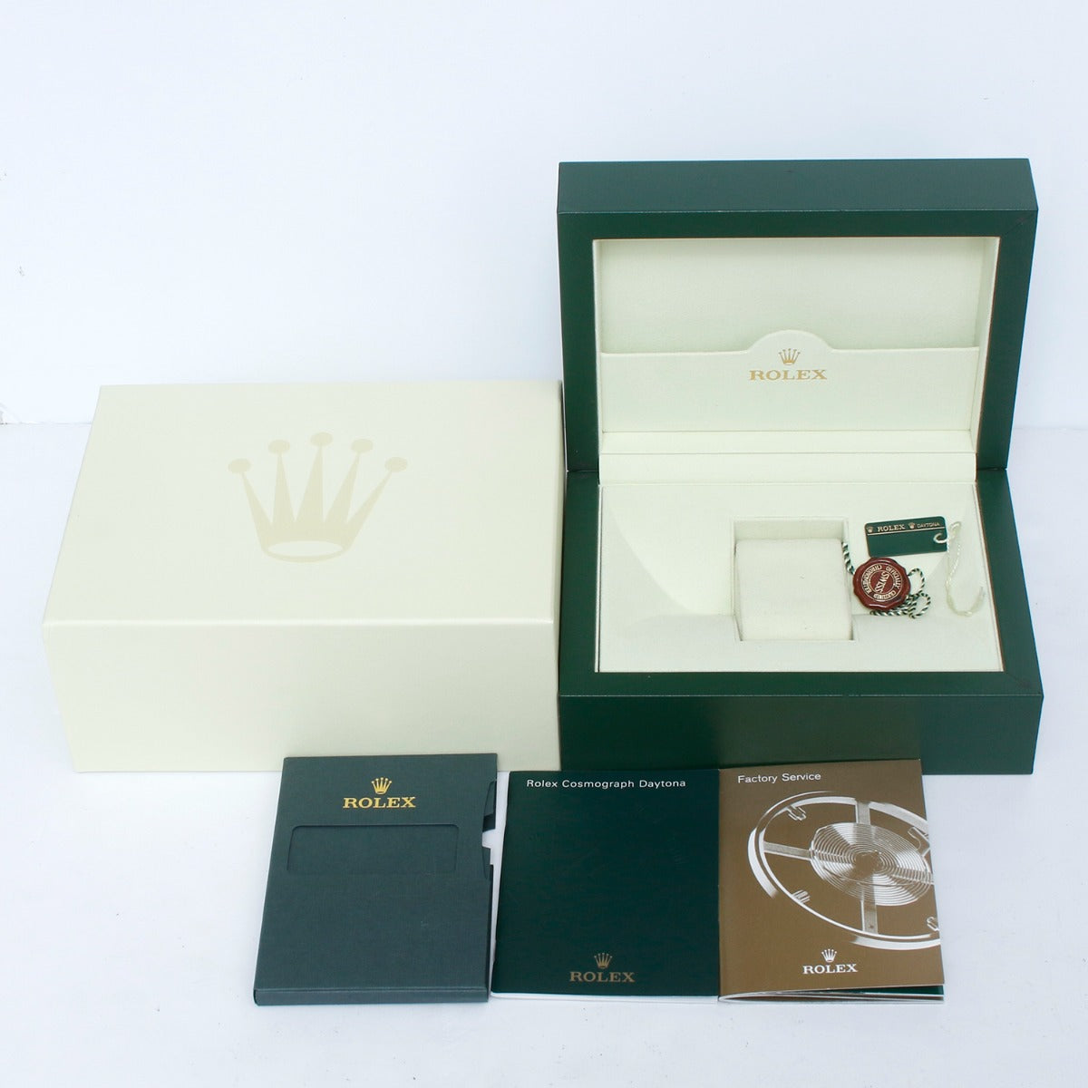 Rolex Daytona, 116528 - Men's automatic-winding chronograph wristwatch. 18k yellow gold case with tachymeter bezel (40mm diameter). Sapphire crystal. Black dial with factory diamond hour markers. 18k yellow gold Oyster bracelet with flip-lock clasp. Pre-owned with Rolex box, books and hang tags
