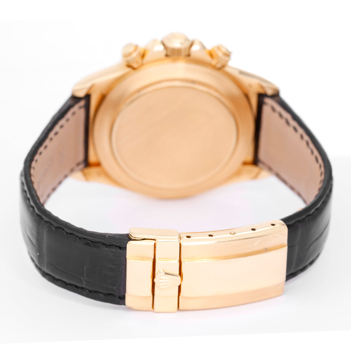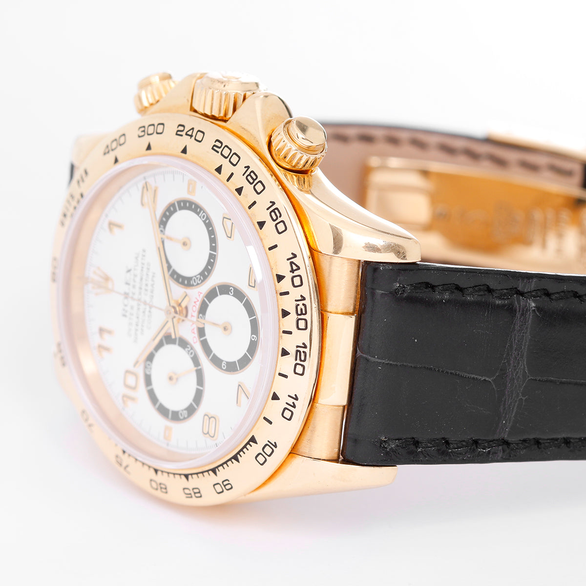 Rolex Cosmograph Daytona Men's 18k Yellow Gold Watch 16518 - Automatic winding, chronograph, 44 jewels, sapphire crystal. 18k yellow gold case and bezel (40mm diameter). White dial with gold Arabic numerals; black rimmed subdials. Black leather strap band and 18k yellow gold deployant clasp. Pre-owned with box and books.