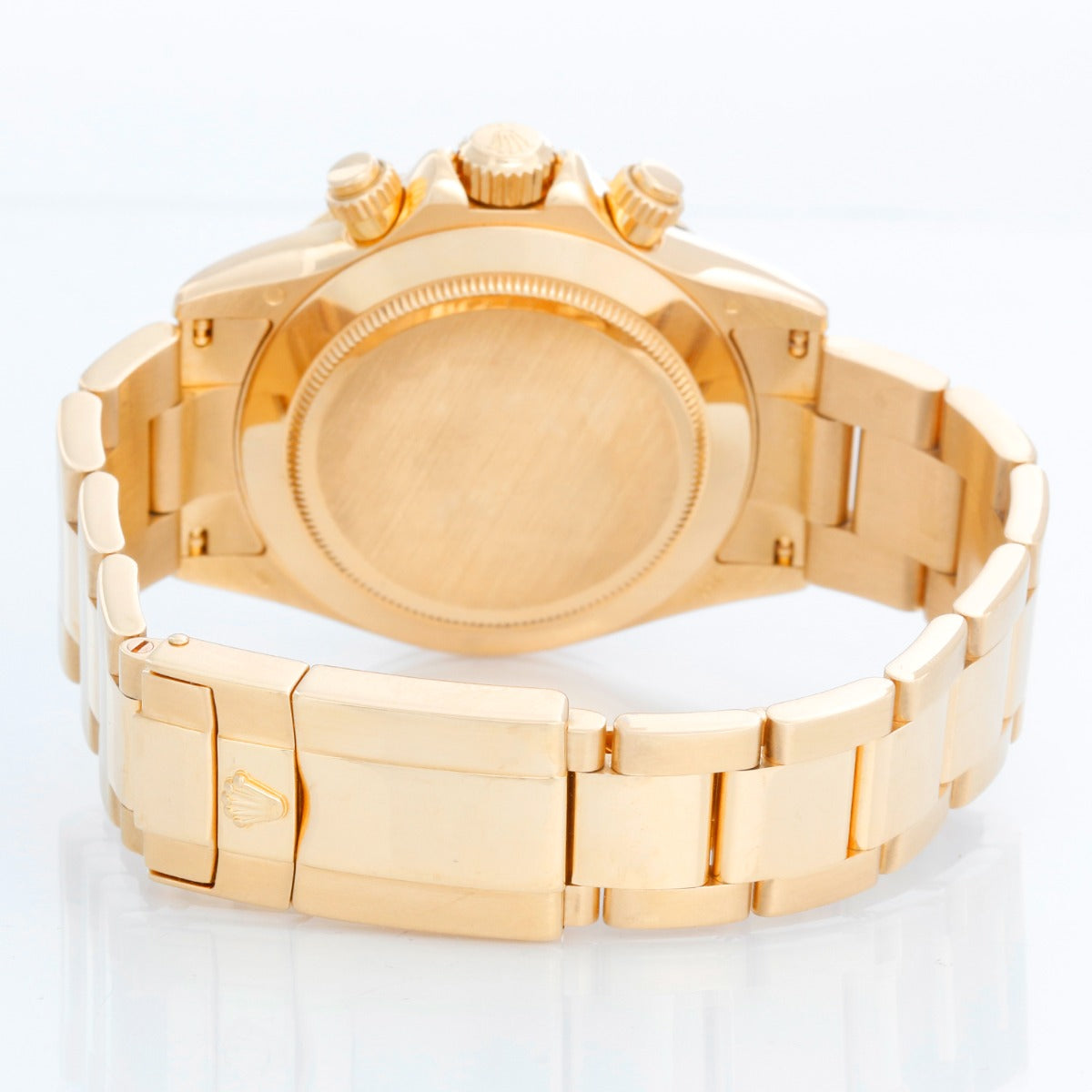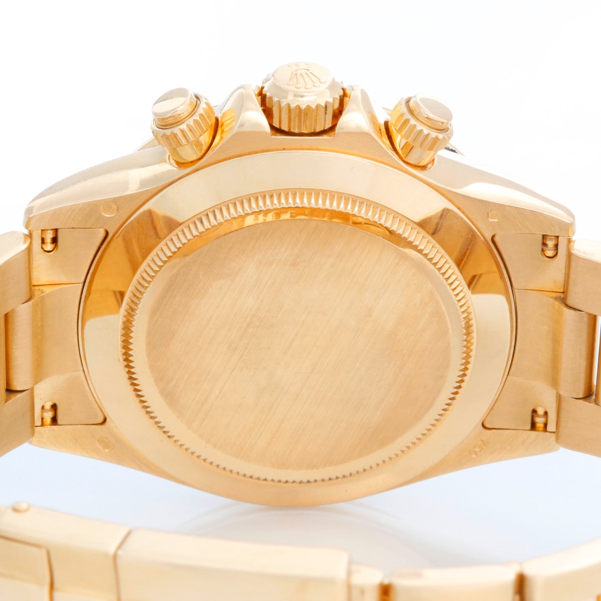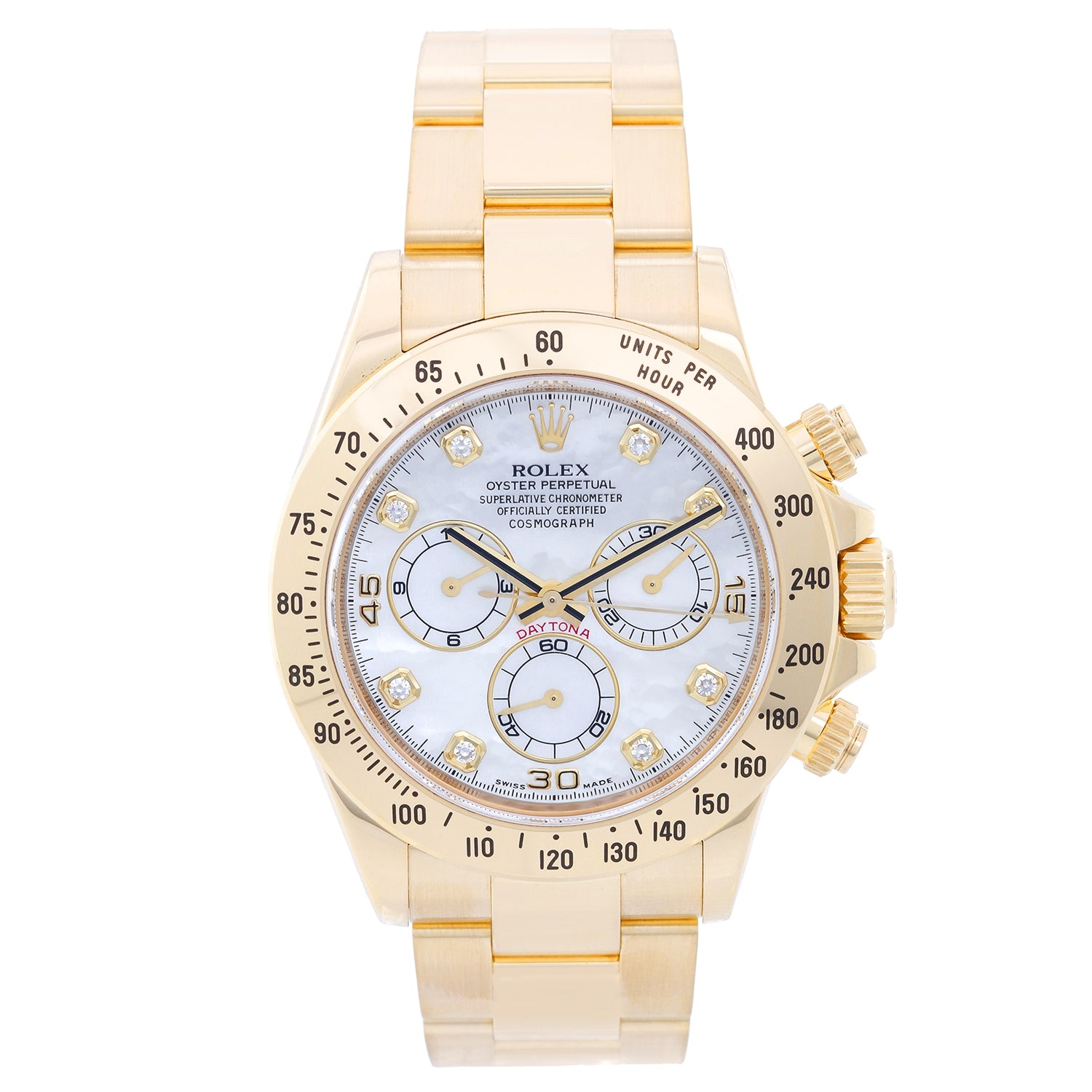 Rolex Cosmograph Daytona Men's Watch 116528 - Automatic winding, chronograph, 44 jewels, sapphire crystal. 18k yellow gold case and bezel . Factory Mother of Pearl with diamond hour markers . 18k yellow gold Oyster bracelet with flip-lock clasp. Pre-owned with Rolex box, books and hangtags