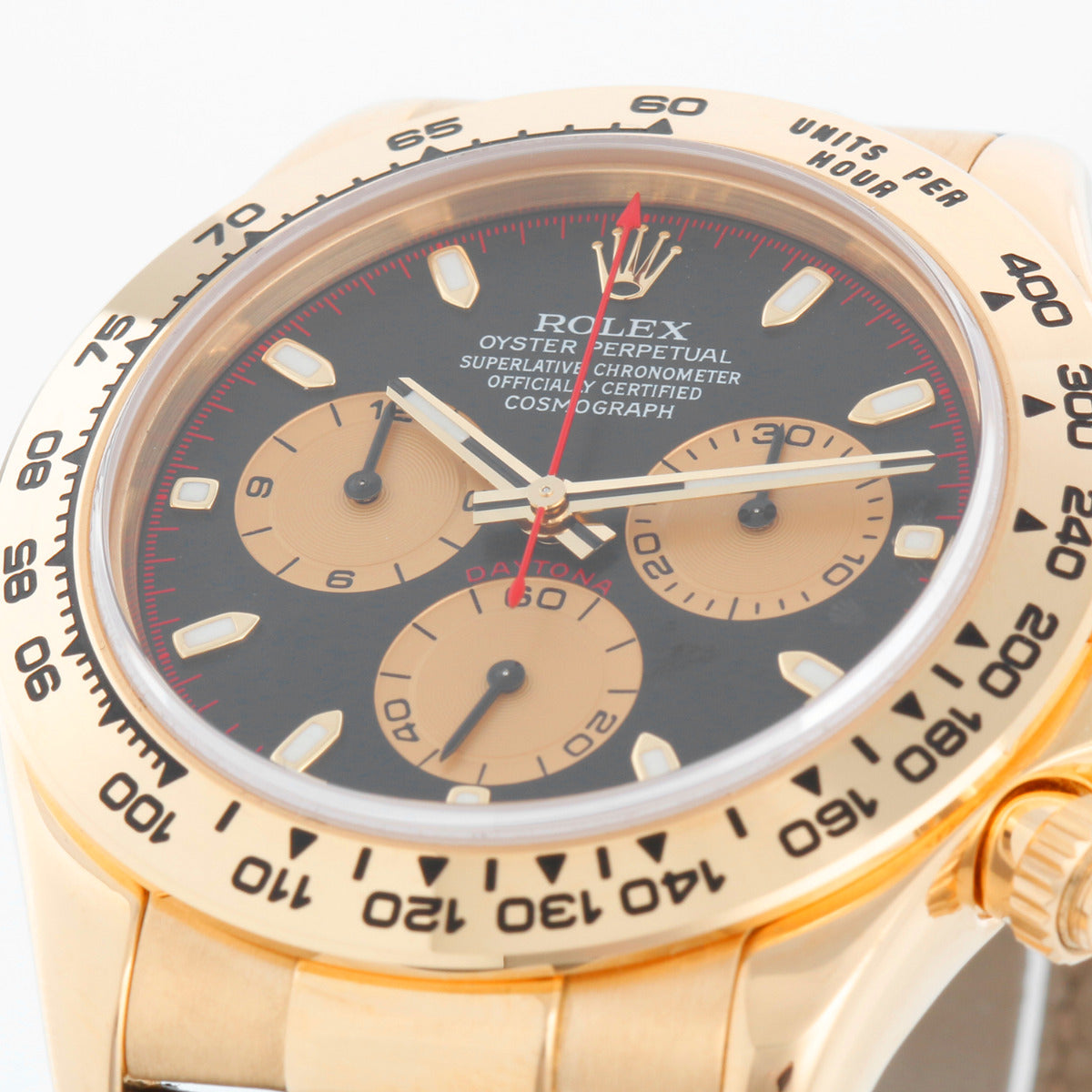 Rolex Cosmograph Daytona with Paul Newman dial, Model 116518 - Men's automatic-winding chronograph wristwatch. 18k yellow gold case with tachymeter bezel (40mm diameter). Sapphire crystal. Paul Newman black dial with champagne subdials and luminous style markers. Strap band with 18k yellow gold Rolex deployant clasp. Pre-owned with box, books and papers. Dated 2006