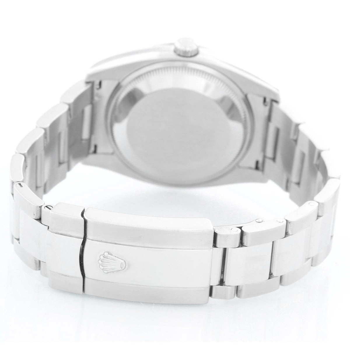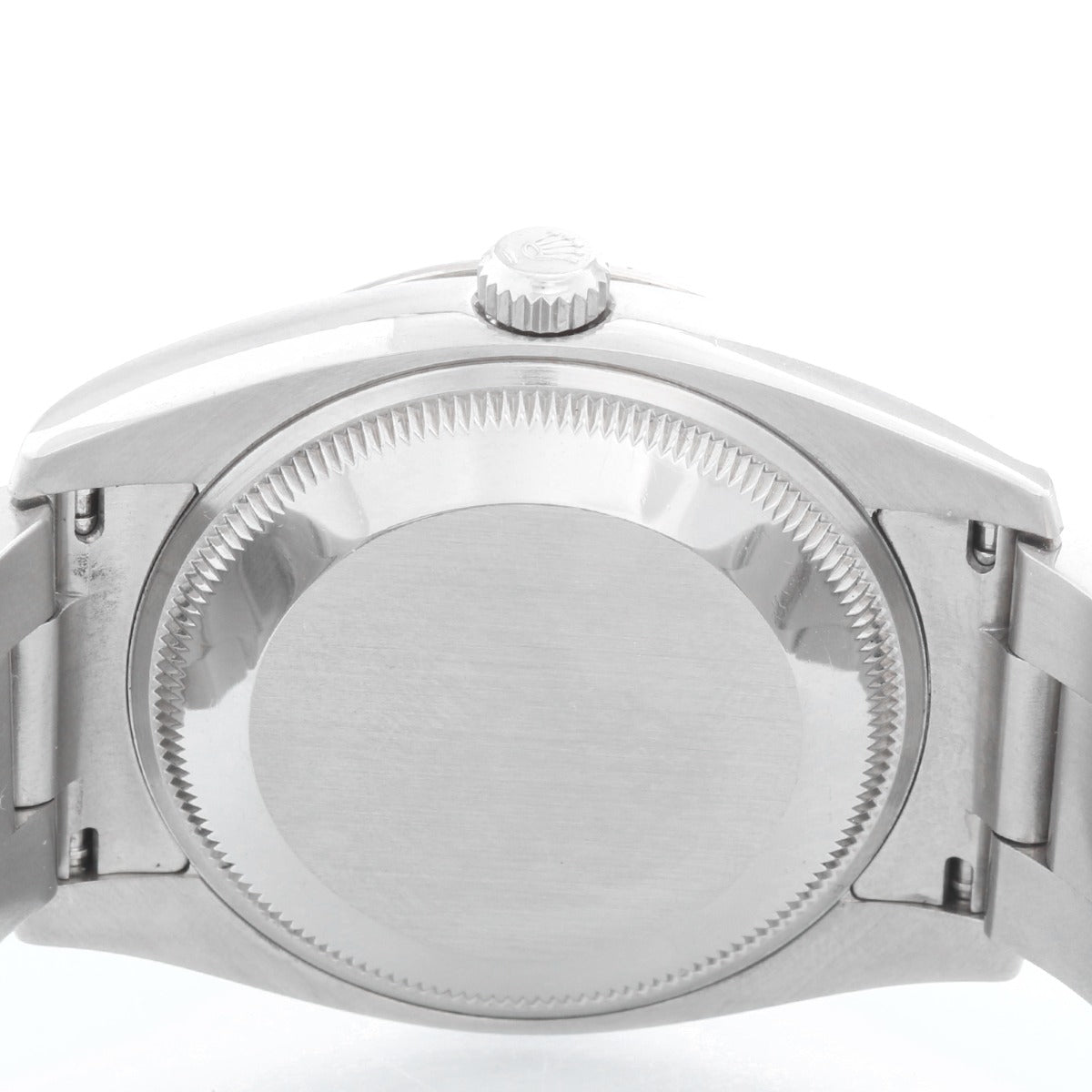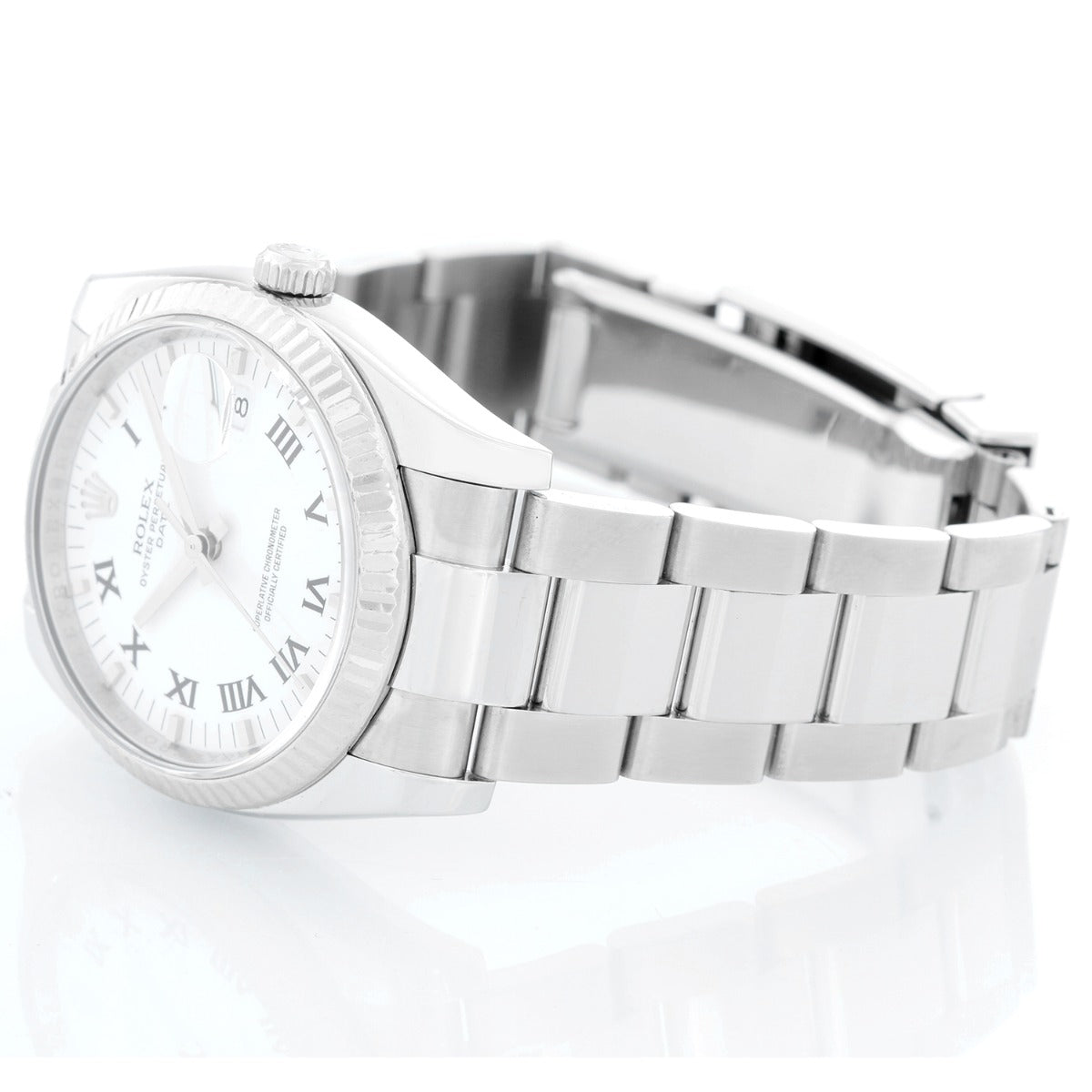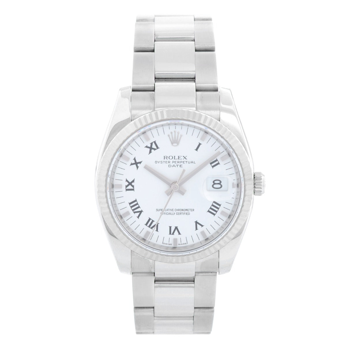 Rolex Date Men's Stainless Steel Watch 115234 - Automatic winding, 31 jewels, Quickset, sapphire crystal. Stainless steel case with 18k white gold fluted bezel ( 34 mm) . White dial with luminous-style stick markers. Stainless steel Oyster bracelet. Pre-owned with custom box