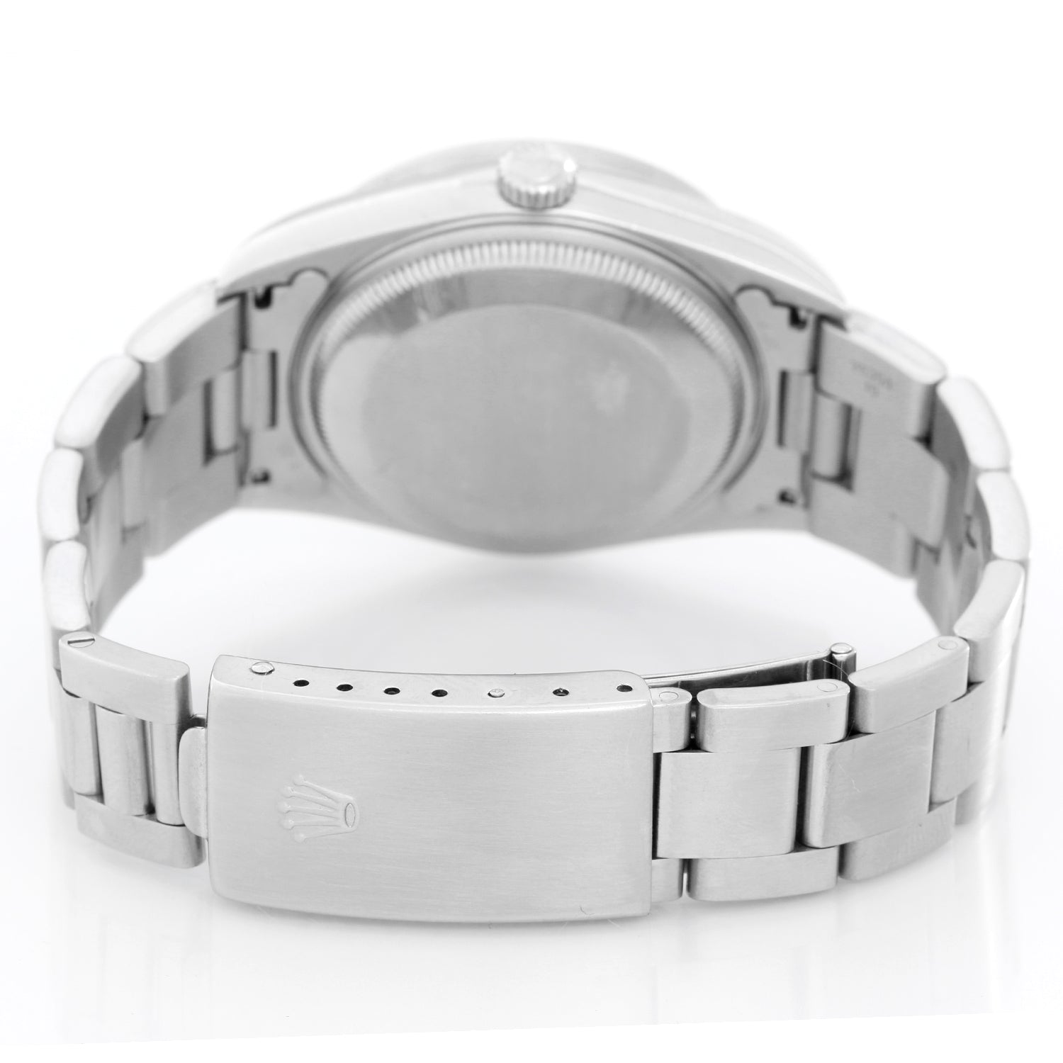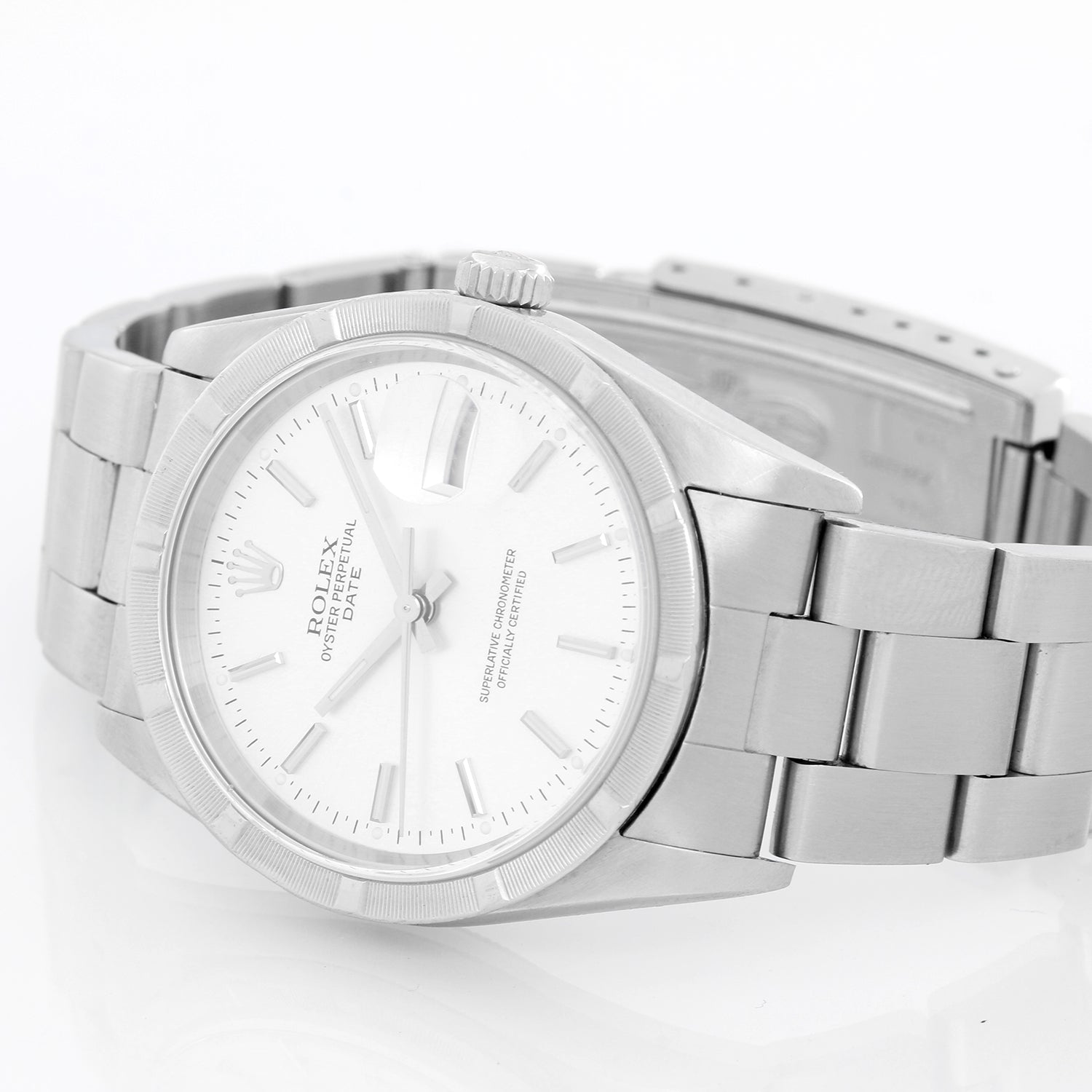 Rolex Date, Model 15210 - Men's automatic winding wristwatch with date. Stainless steel case with finely engine turned bezel (34mm diameter). Silver dial with stick hour markers. Stainless steel Oyster bracelet. Pre-owned with box.