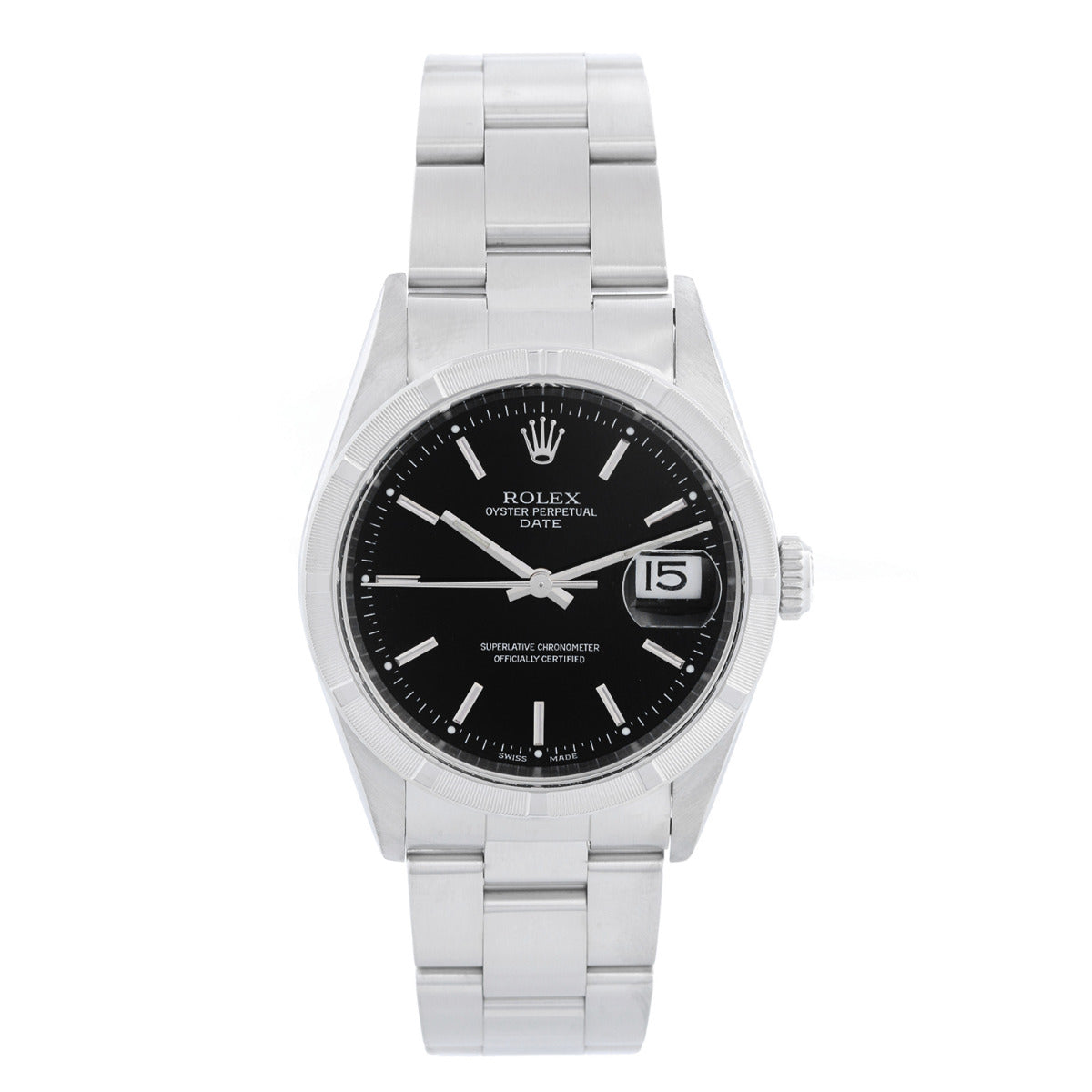 Rolex Date Men's Stainless Steel Watch Engine Turned Bezel 15210 - Automatic winding, 31 jewels, Quickset, sapphire crystal. Stainless steel case with engine turned bezel (34mm diameter). Black dial with stick markers. Stainless steel Oyster bracelet. Pre-owned with custom box.