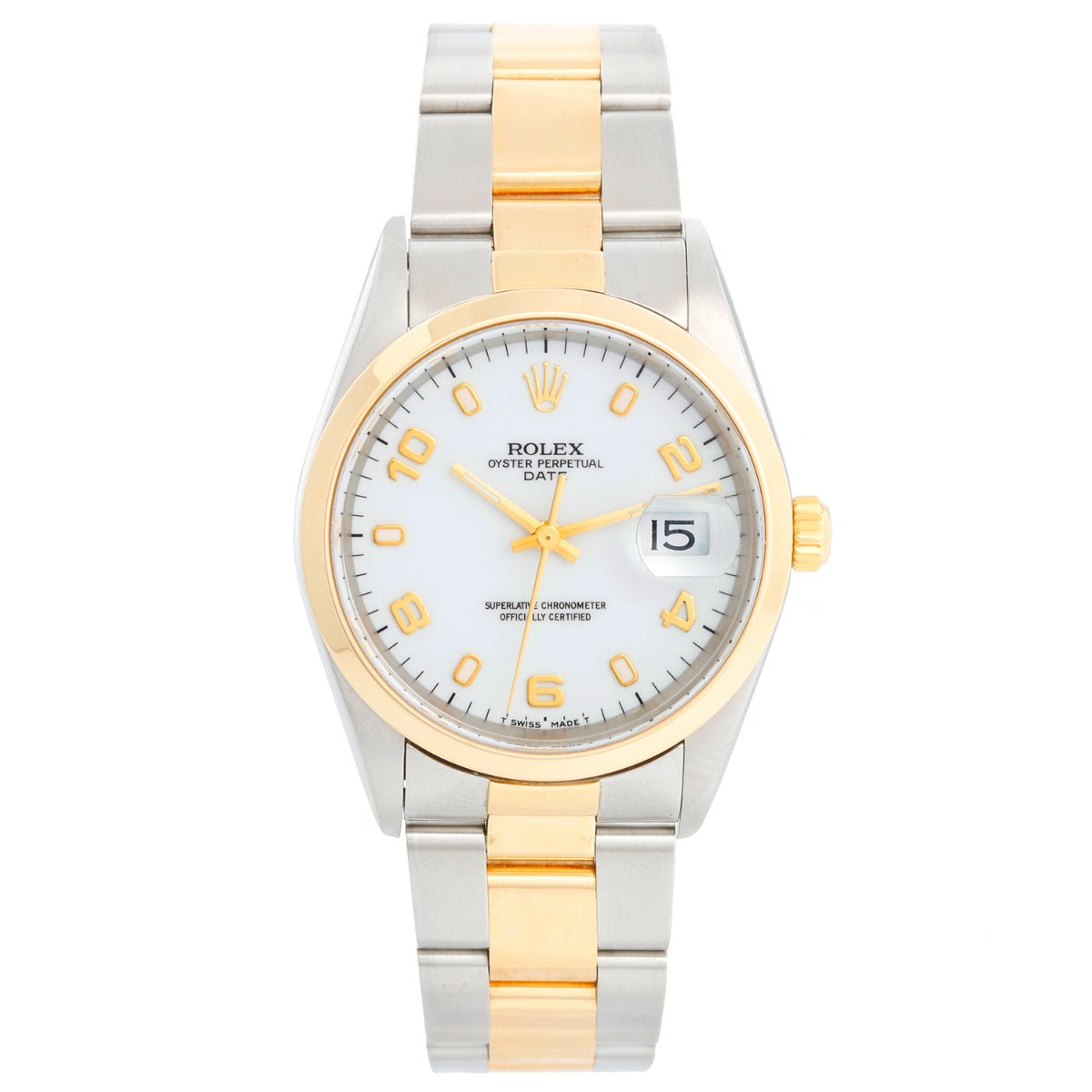 Rolex Date Men's 2-Tone Steel & Gold Watch 15203 - Automatic winding, 31 jewels, Quickset, sapphire crystal. Stainless steel case with 18k yellow gold smooth bezel (34mm diameter) Original Rolex finish. White dial with gold Arabic numerals . Stainless steel and 18k yellow gold Oyster bracelet. Pre-owned with custom box .