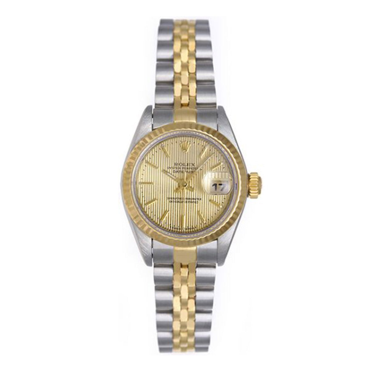 Rolex Ladies Datejust 2-tone Steel & Gold Watch 69173 - Automatic winding, 29 jewels, Quickset date, sapphire crystal. Stainless steel case with 18k yellow gold fluted bezel (26mm diameter). Rolex champagne Tapestry dial with stick markers. Stainless steel and 18k yellow gold Jubilee bracelet. Pre-owned with custom box.
