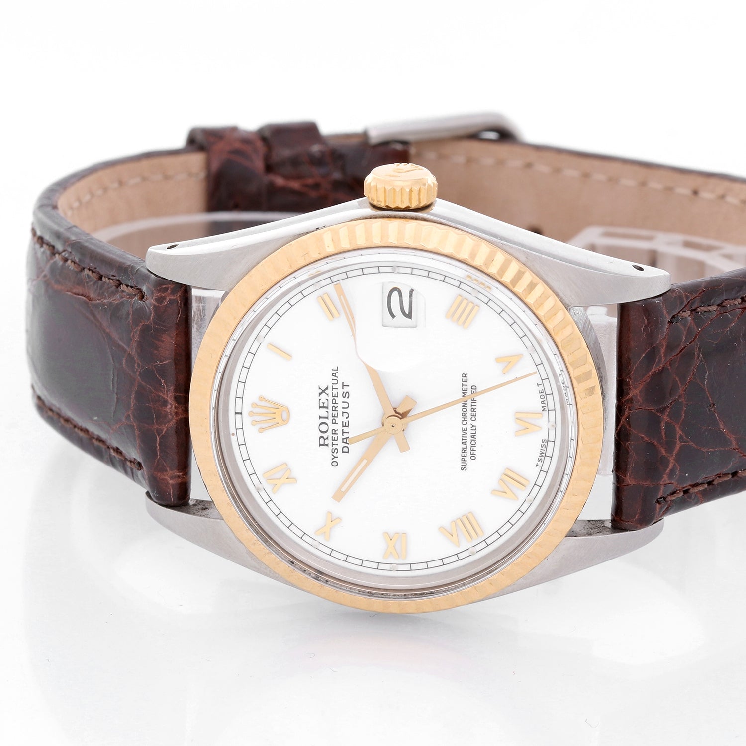 Rolex Datejust 2-Tone Men's Watch 16013 - Automatic winding, quickset. Stainless steel and 18k yellow gold fluted bezel (36mm diameter). White dial with Roman numerals. Strap band. Pre-owned with custom box.