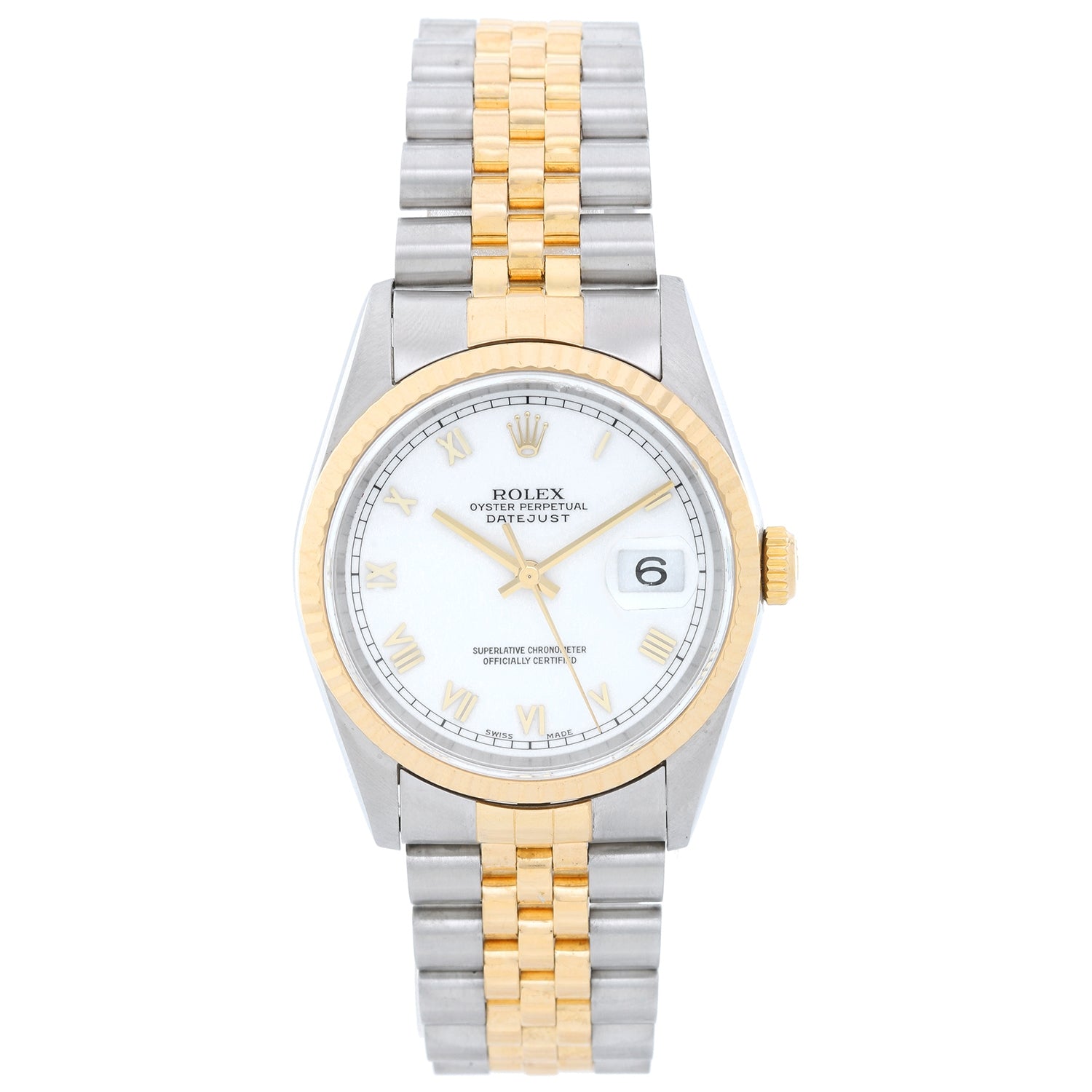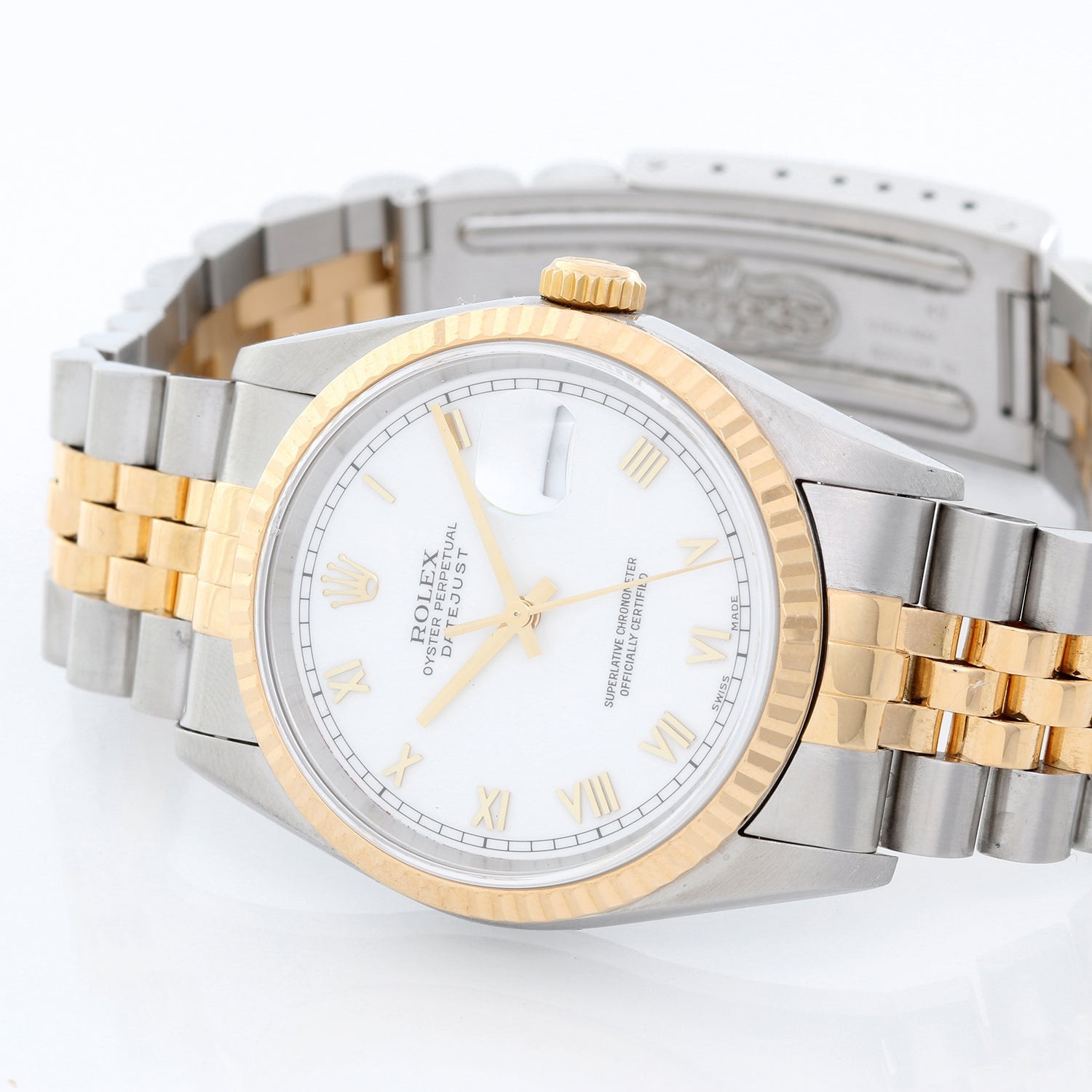 Rolex Datejust 2-Tone Men's Steel & Gold Watch 16233 - Automatic winding, Quickset, sapphire crystal. Stainless steel case with 18k yellow gold fluted bezel (36mm diameter). White dial with gold Roman numerals. Stainless steel and 18k yellow gold Jubilee bracelet. Pre-owned with custom box