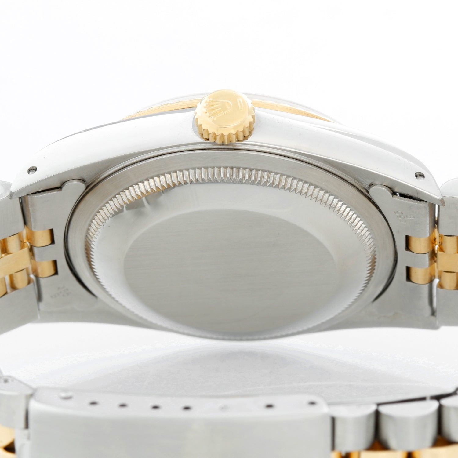 Rolex Datejust 2-Tone Steel & Gold Men's Watch 16013 - Automatic winding, 27 jewels, Quickset, acrylic crystal. Stainless steel case with 18k yellow gold fluted bezel (36mm diameter). White dial with gold stick markers. Stainless steel and 18k yellow gold Jubilee bracelet. Pre-owned with custom box.