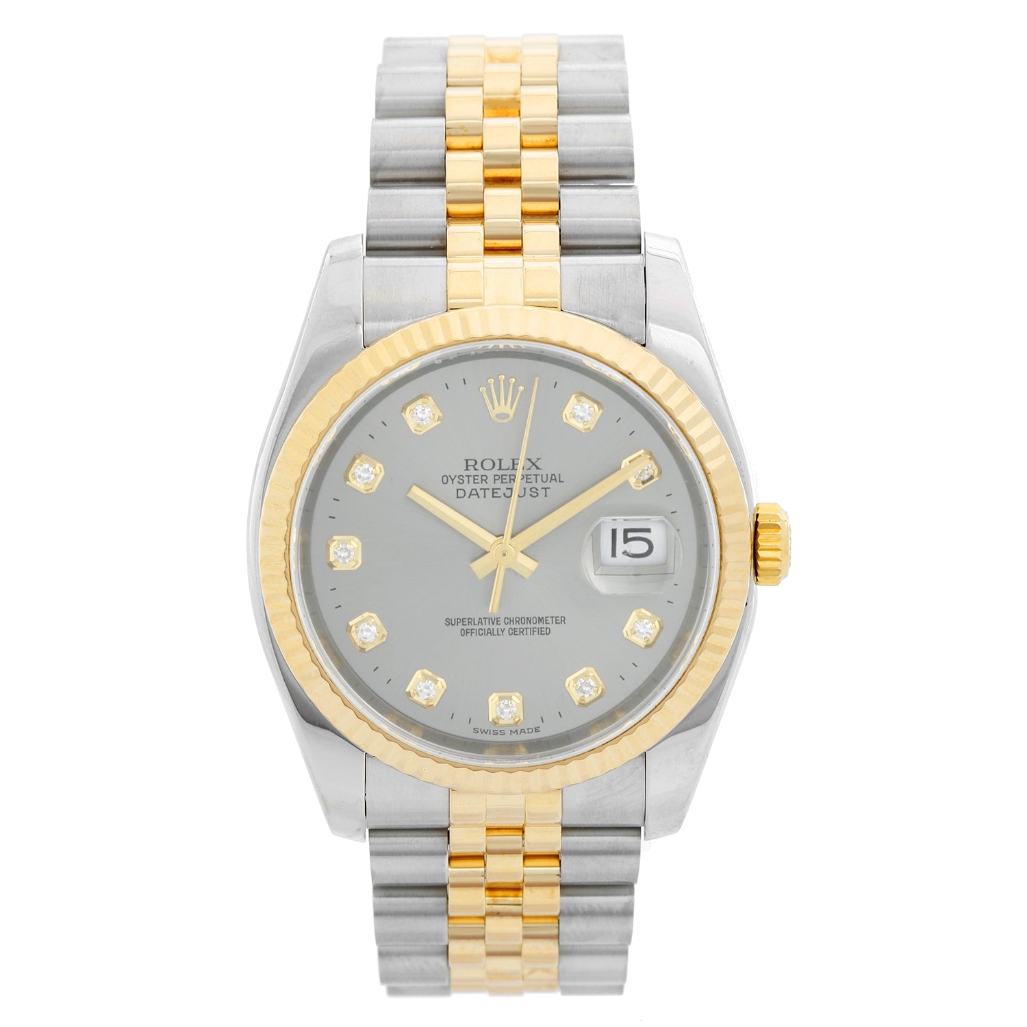 Rolex Datejust 2-Tone Steel & Gold Men's Watch Silver Diamond Dial 116233 - Automatic winding, 31 jewels, Quickset, sapphire crystal. Stainless steel with 18k yellow gold fluted bezel (36mm diameter). Silver dial with factory diamonds. Stainless steel and 18k yellow gold Jubilee bracelet. Pre-owned with custom box