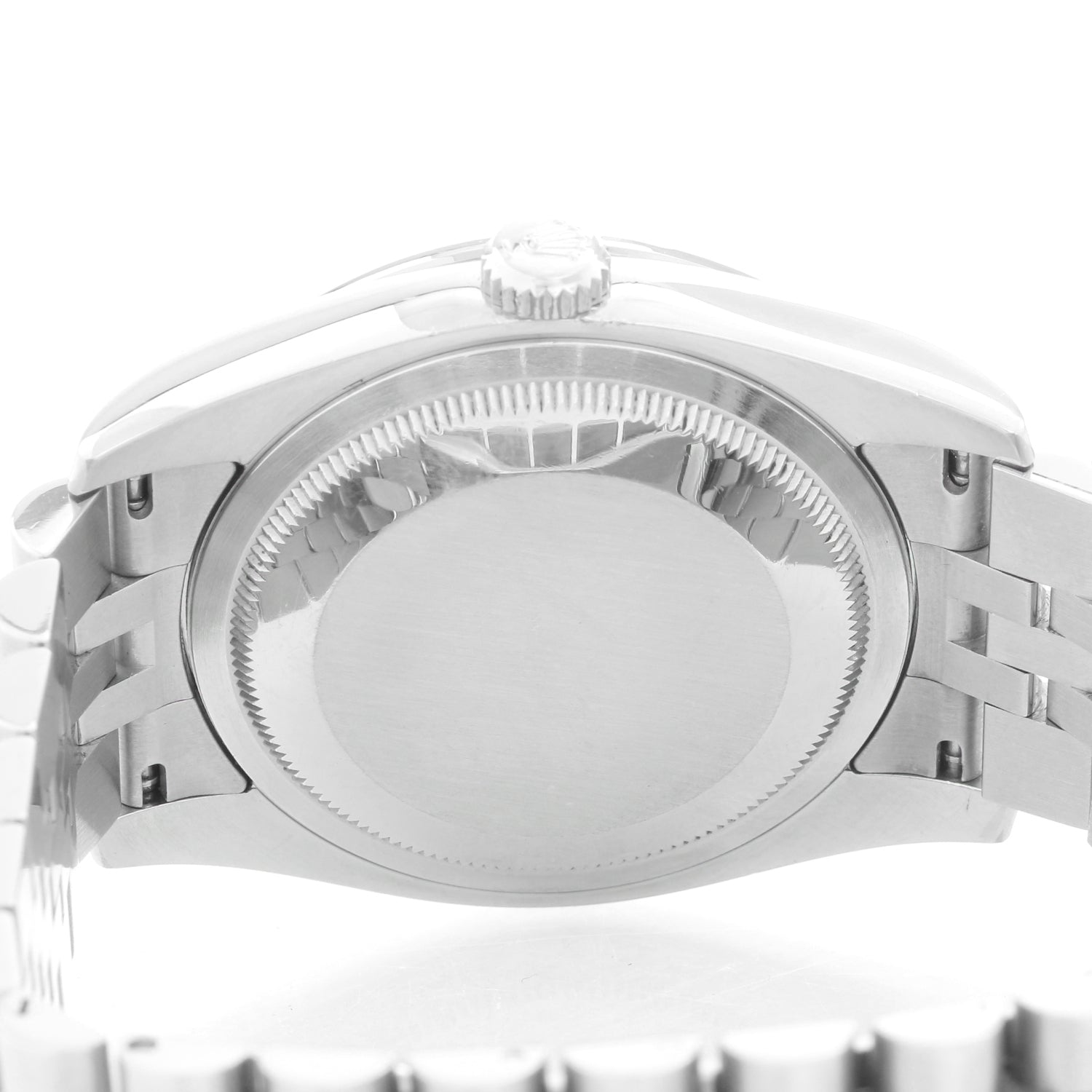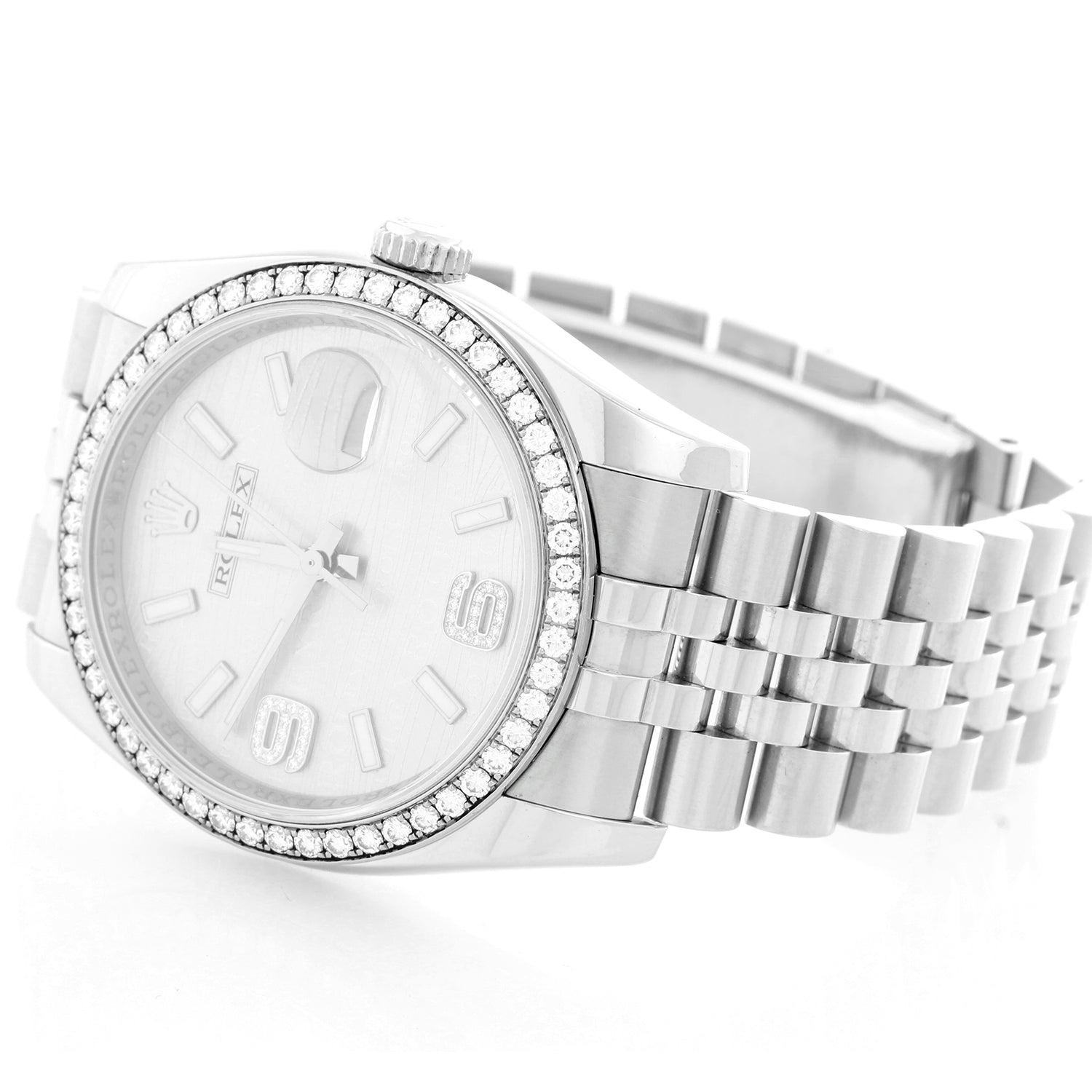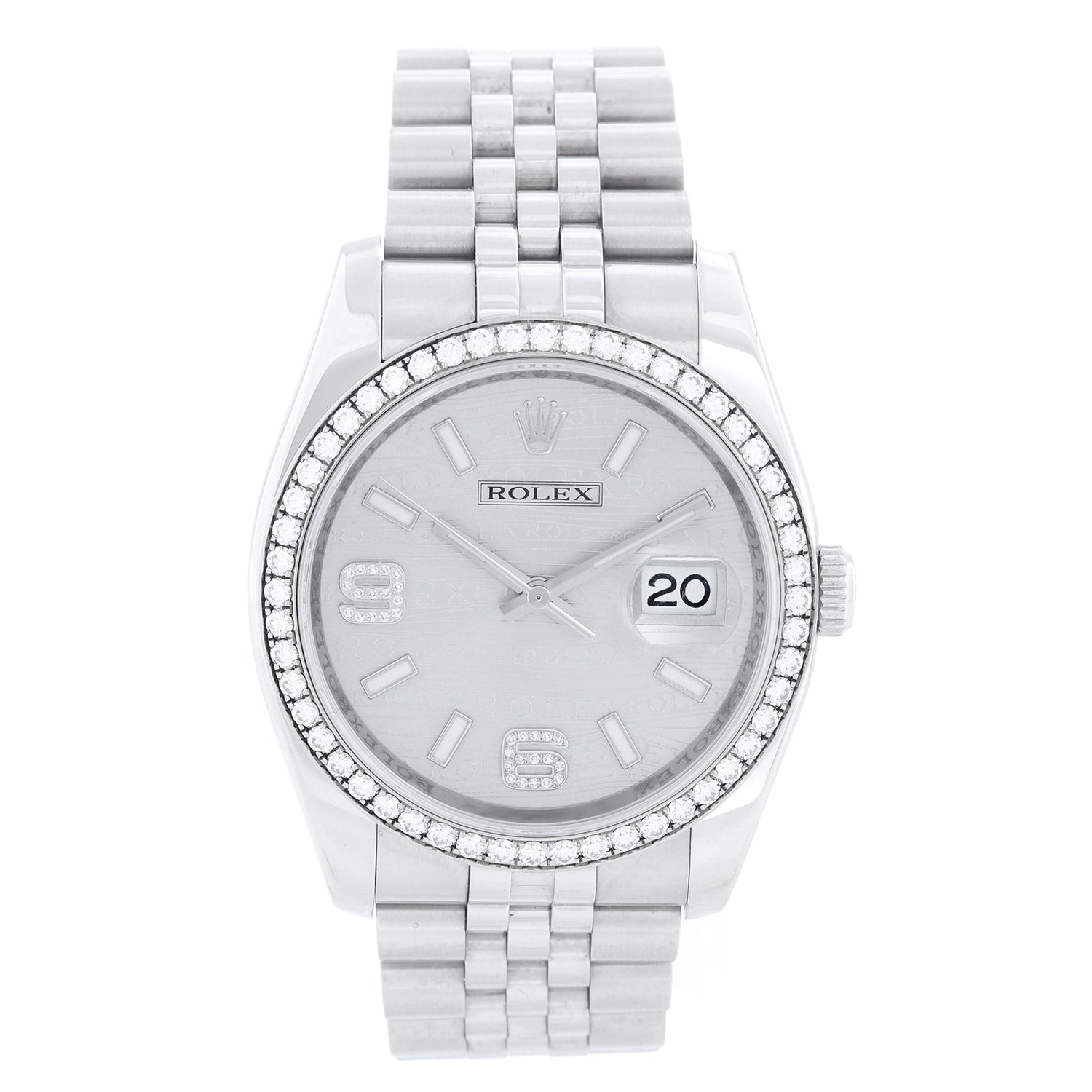 Rolex Datejust Diamond Bezel Men's Steel Watch 116244 - Automatic winding, 31 jewels, Quickset, sapphire crystal. Stainless steel case with factory 52 diamond and 18k white gold bezel (36mm diameter). Rhodium Waves dial with silver-tone hands and diamond hour markers. Stainless steel Jubilee bracelet. Pre-owned with Rolex box and books.