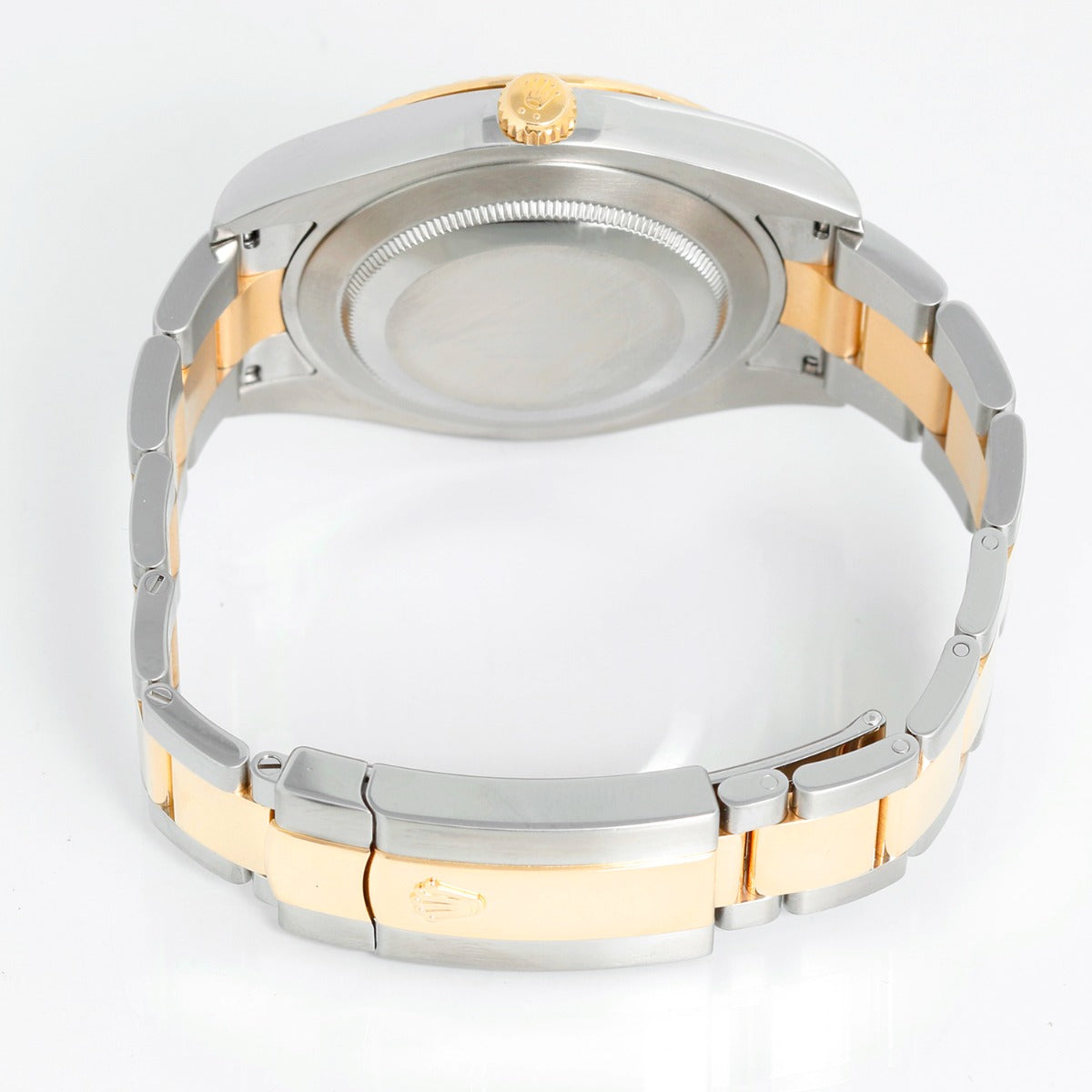 Rolex Datejust II Men's 2-Tone Steel & Gold 41mm Watch 116333 - Automatic winding, Quickset, sapphire crystal. Stainless steel case with 18k yellow gold fluted bezel (41mm diameter). Slate Gray dial with green Roman numerals; Marker at 9 o'clock. Stainless steel and 18k yellow gold Oyster bracelet. Pre-owned with Rolex box and card and hang tags included. Card dated 2013