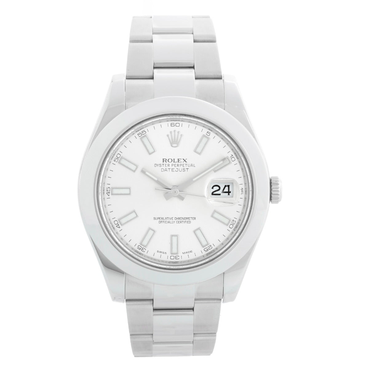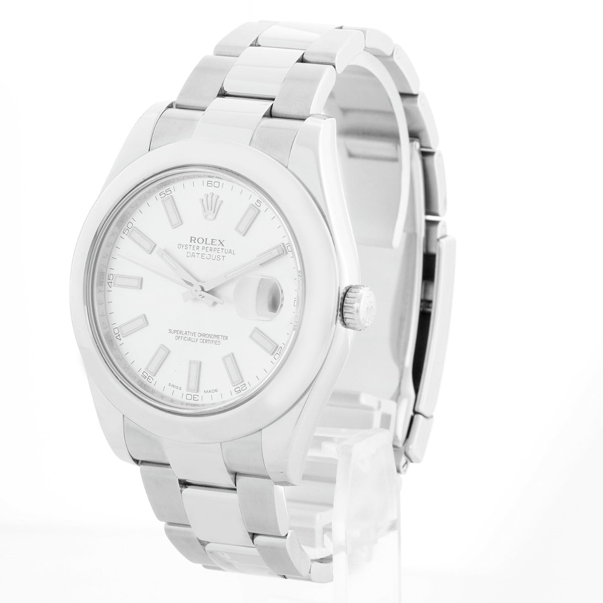 Rolex Datejust II Men's 41mm Silver Dial Stainless Steel Watch 116300 - Automatic winding, sapphire crystal,. Stainless steel case with smooth bezel (41mm diameter). Silver dial with baton markers. Stainless steel Oyster bracelet with flip lock clasp. Pre-owned with Rolex Travel box and books, card. Dated 2013