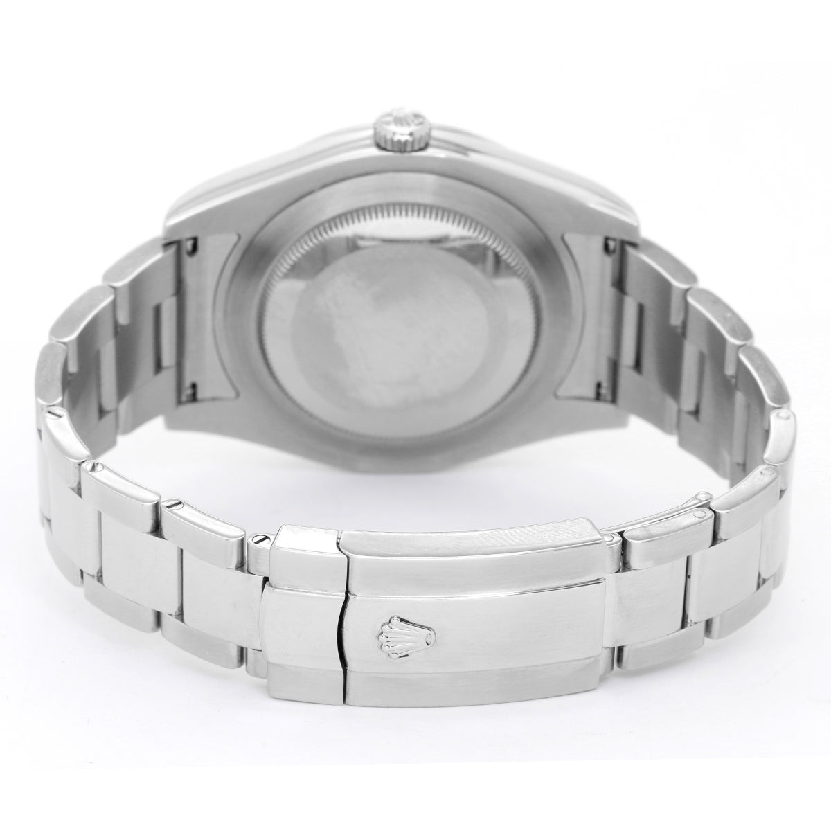 Automatic winding, sapphire crystal, serial number engraved in bezel. Stainless steel case with smooth domed bezel (41mm diameter).Black dial with Roman numerals.. Stainless steel Oyster bracelet with flip lock clasp. Pre-owned with custom box