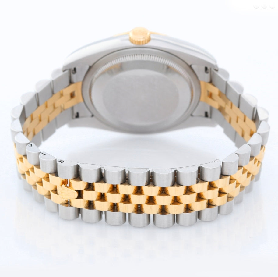 Rolex Datejust Men's 2-Tone Steel & Gold Watch Black Diamond Dial 116233 - Automatic winding, 31 jewels, Quickset, sapphire crystal. Stainless steel case with fluted bezel (36mm diameter). Black dial with factory diamond hour markers. Stainless steel and 18k yellow gold Jubilee bracelet. Pre-owned with custom box