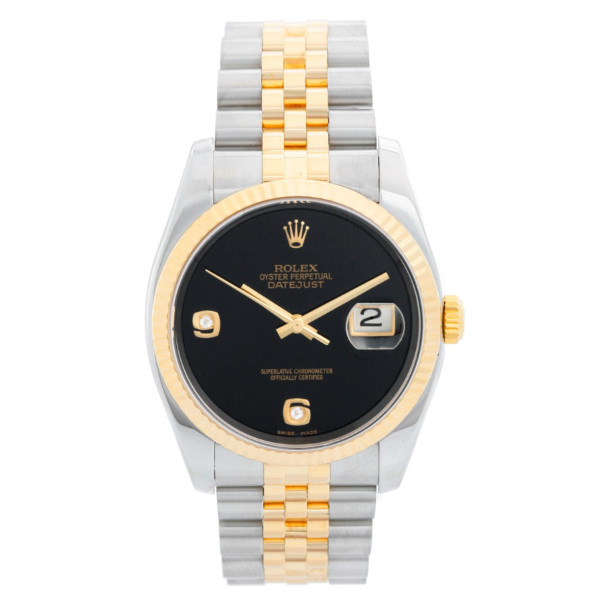 Rolex Datejust Men's 2-Tone Steel & Gold Watch Jubilee 116233 - Automatic winding, 31 jewels, Quickset, sapphire crystal. Stainless steel case with fluted bezel (36mm diameter). Factory Onyx dial with diamond 9 & 6 o'clock. Stainless steel and 18k yellow gold Jubilee bracelet. Pre-owned with custom box.