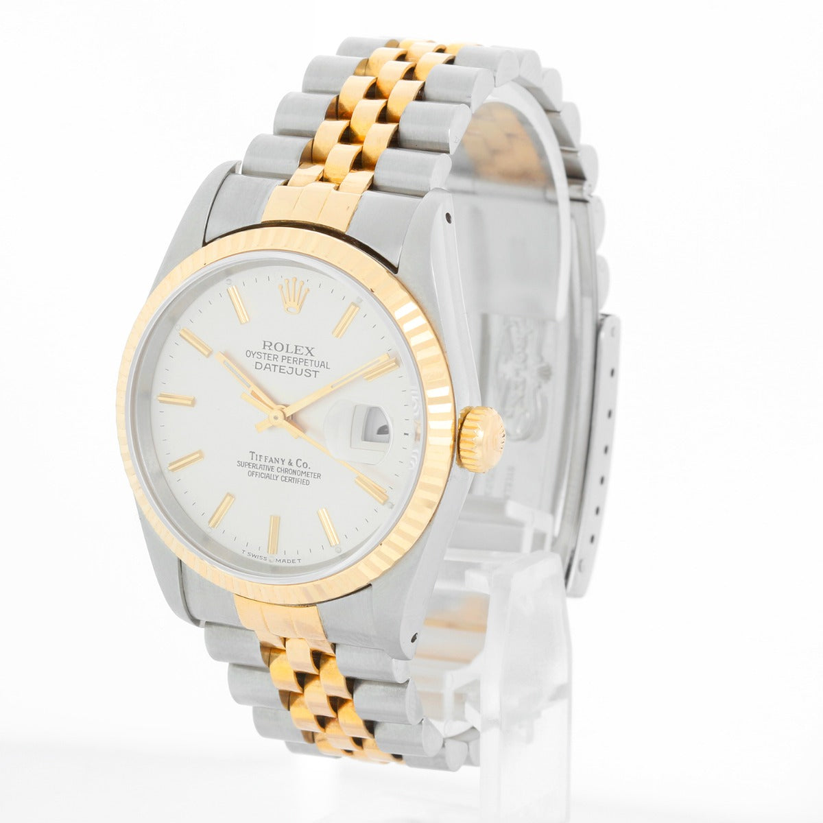Rolex Datejust Men's 2-Tone Tiffany Dial Watch 16233 - Automatic winding, 31 jewels, Quickset, sapphire crystal. Stainless steel with 18k yellow gold fluted bezel (36mm diameter). Rare Silver Tiffany Dial. Rolex Stainless steel and 18k yellow gold Jubilee bracelet. Pre-owned with Rolex travel box.