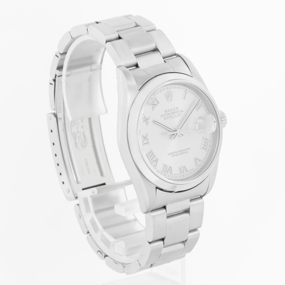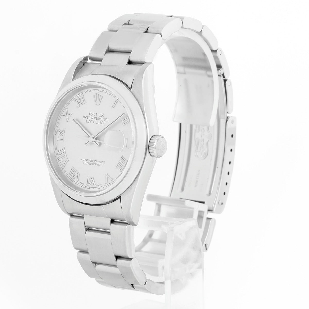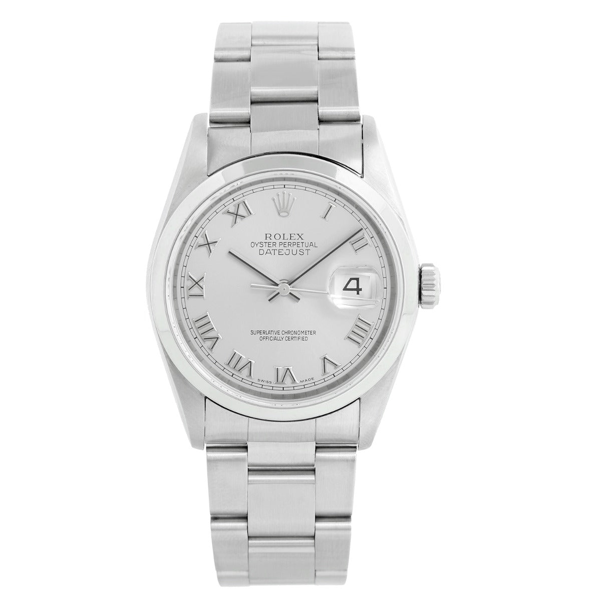 Rolex Datejust Men's Stainless Steel Automatic Watch Smooth Bezel 16200 - Automatic winding, Quickset, sapphire crystal. Stainless steel case with smooth bezel (36mm diameter). Rhodium/silver dial with Roman numerals. Stainless steel Oyster bracelet. Pre-owned with custom box