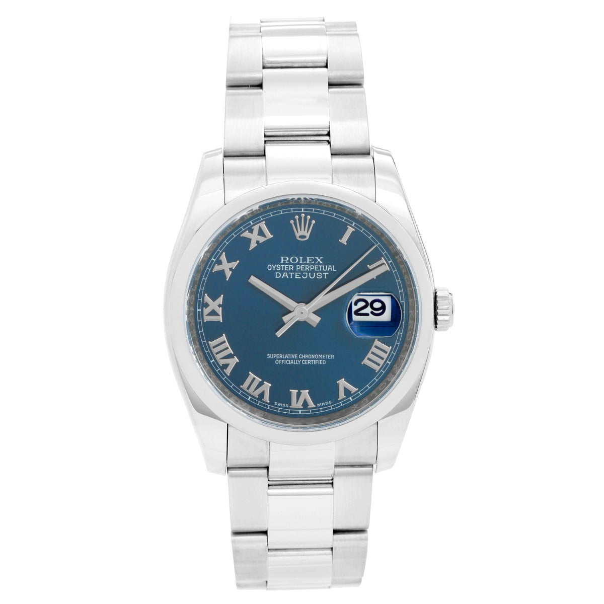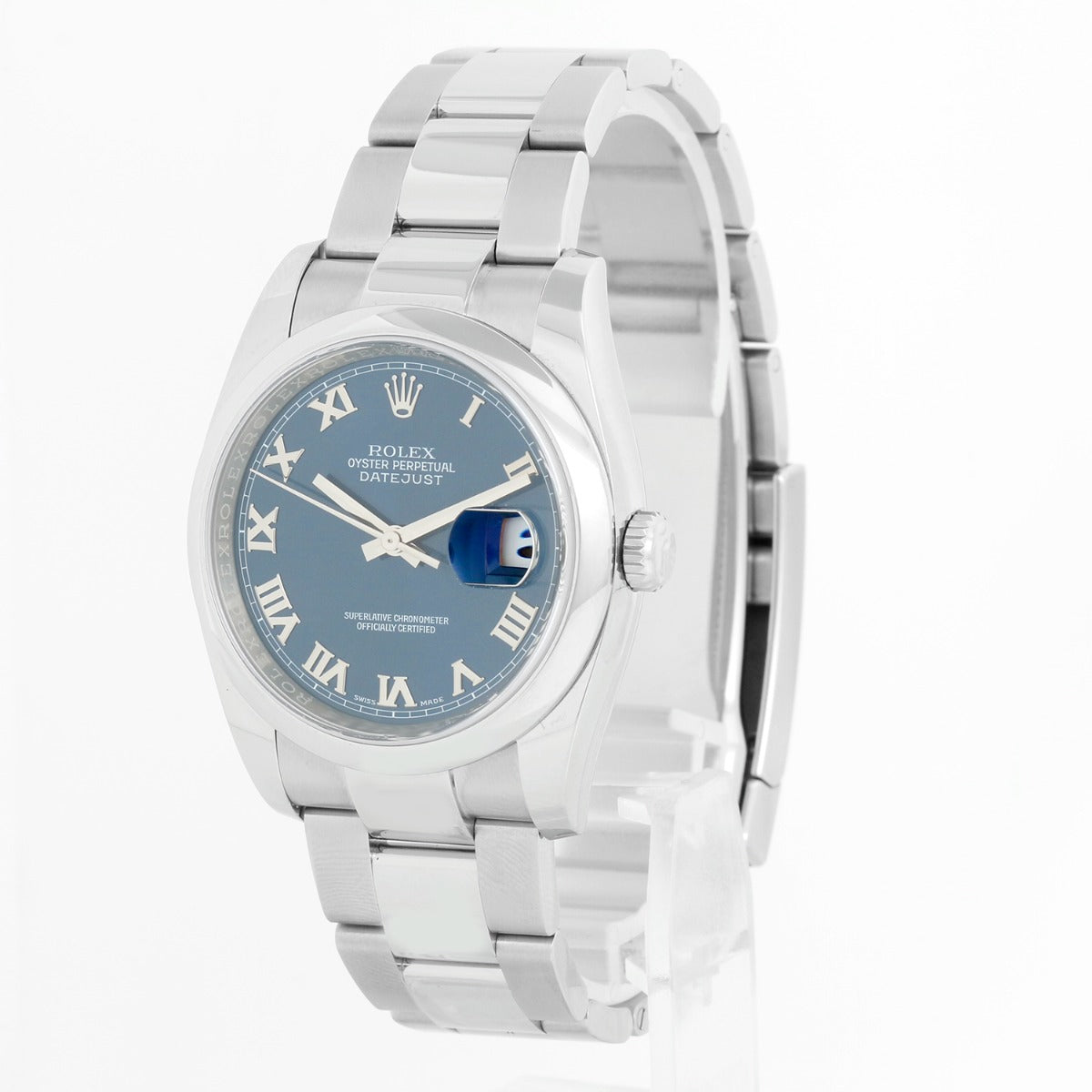 Rolex Datejust Stainless Steel Watch 116200 Blue Dial Men's - Automatic winding, 31 jewels, Quickset, sapphire crystal. Stainless steel case with smooth bezel ( 36 mm0 . Blue dial. Stainless steel Oyster bracelet. Pre-owned with Rolex travel pouch and card. dated 2019.