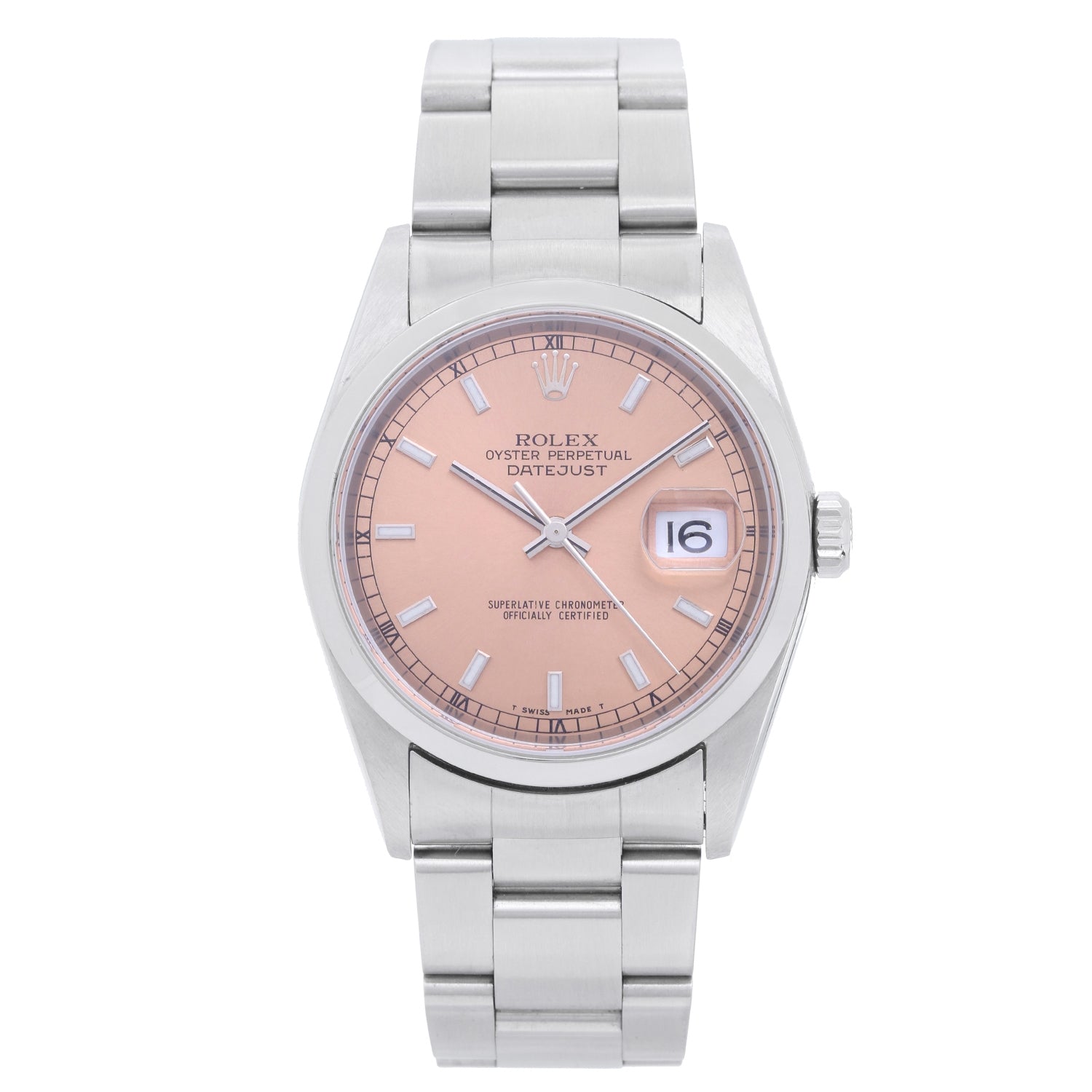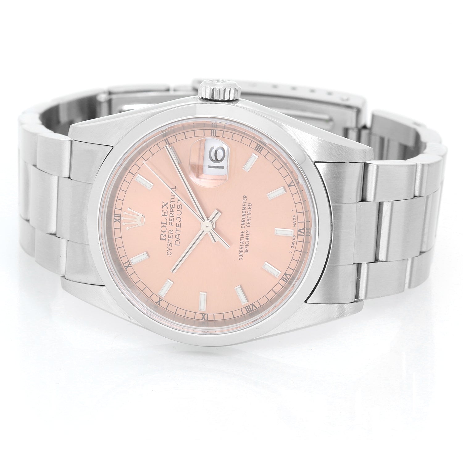 Rolex Datejust Men's Stainless Steel Watch 16200 - Automatic winding, Quickset, sapphire crystal. Stainless steel case with smooth bezel (36mm diameter). Updated New-style Salmon dial with luminous markers installed. Stainless steel Osyter bracelet. Pre-owned with custom box