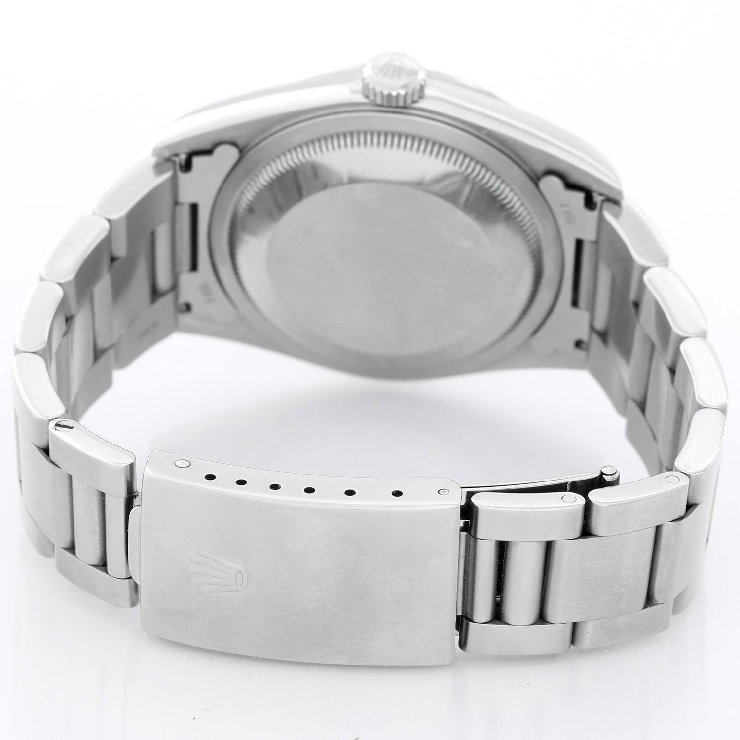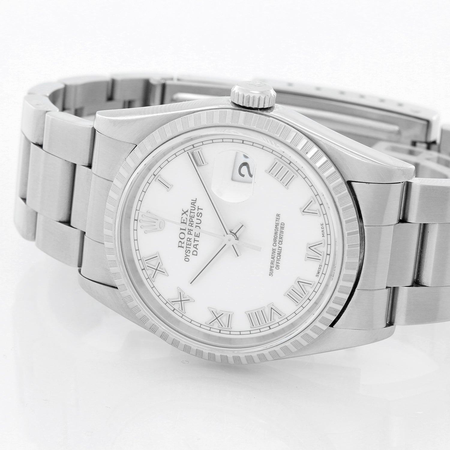 Rolex Datejust Men's Stainless Steel Watch 16220 - Automatic winding, 31 jewels, Quickset, sapphire crystal. Stainless steel case with engine turned bezel (36mm diameter). White dial with Roman numerals. Stainless steel Oyster bracelet Pre-owned with custom box