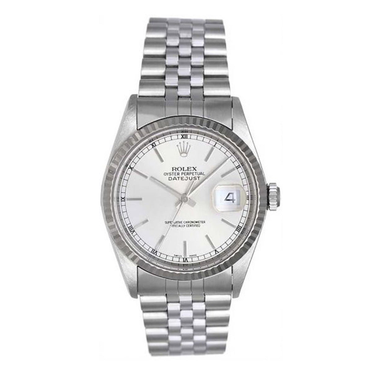 Men's Rolex Datejust Model 16234, Automatic winding wristwatch with date. Stainless steel case with 18k white gold fluted bezel (36mm diameter). Silver dial with stick markers. Stainless steel Jubilee bracelet. Pre-owned with custom box