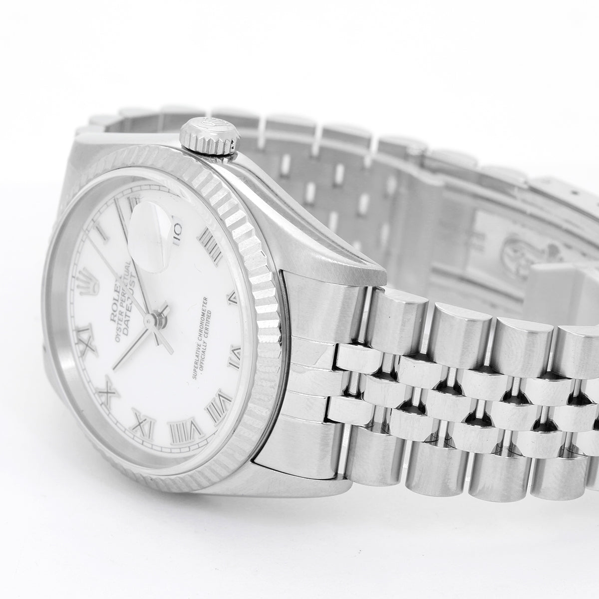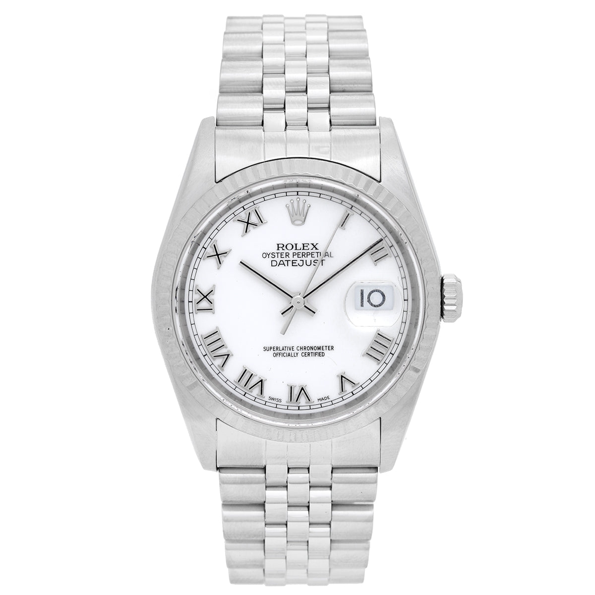 Men's Rolex Datejust Model 16234, Automatic winding wristwatch with date. Stainless steel case with 18k white gold fluted bezel (36mm diameter). White dial with silver colored Roman numerals. Stainless steel Jubilee bracelet. Pre-owned with custom box