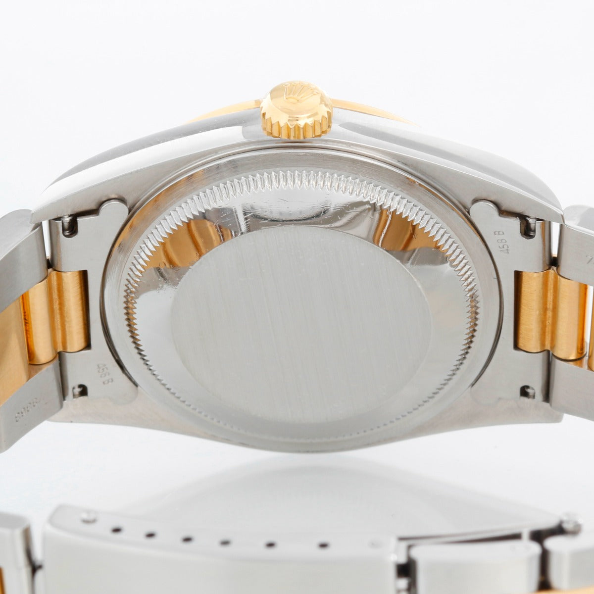 Rolex Datejust Men's 2-Tone Steel & Gold Watch 16203 - Automatic winding, 31 jewels, Quickset, sapphire crystal. Stainless steel with 18k yellow gold smooth bezel (36mm diameter). Rhodium dial with roman numerals . Rolex Two- tone Oyster bracelet. Pre-owned with custom box.