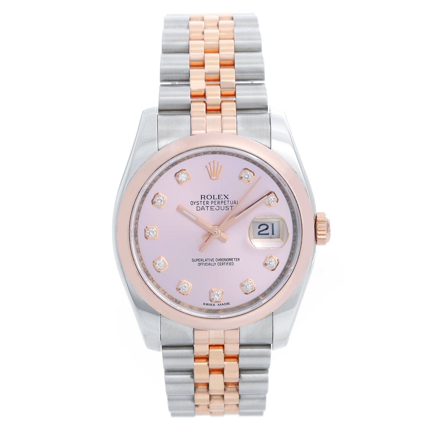 Rolex Datejust Men's Steel & Rose Gold Watch 116201 - Automatic winding, 31 jewels, Quickset, sapphire crystal. Stainless steel case with 18k rose gold smooth bezel. Rose dial with diamond hour markers. Stainless steel and 18k rose gold Jubilee bracelet. Pre-owned with box and books.