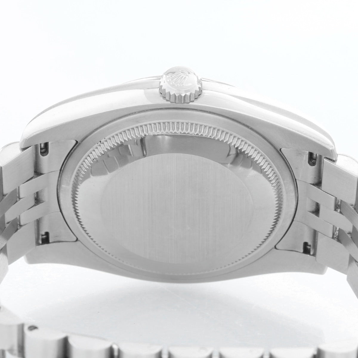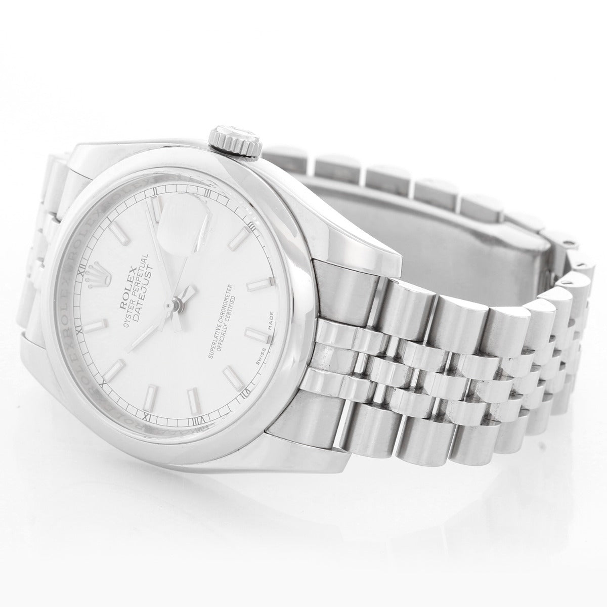 Rolex Datejust Men's Stainless Steel Automatic Winding Watch 116200 - Automatic winding, 31 jewels, Quickset, sapphire crystal. Stainless steel case with smooth bezel (36mm diameter). Silver dial with luminous stick hour markers . Stainless steel Jubilee bracelet. Pre-owned with custom box