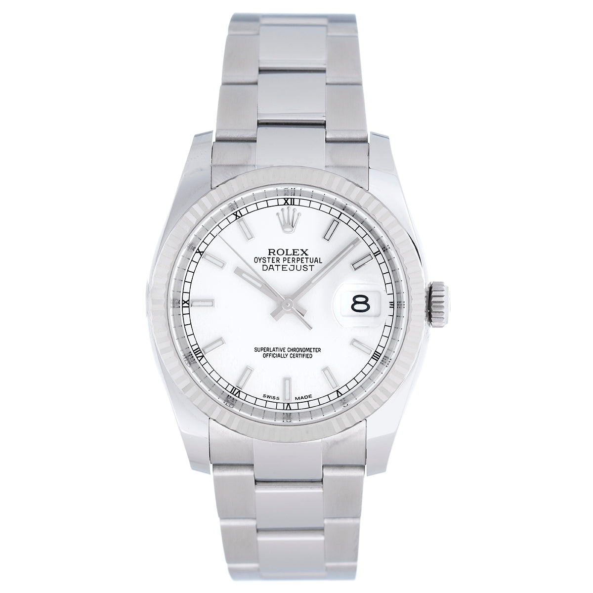 Rolex Datejust Men's Steel Watch 116234 - Automatic winding, 31 jewels, Quickset, sapphire crystal. Stainless steel case with 18k white gold fluted bezel (36mm diameter). White dial with luminous markers. Stainless steel Oyster bracelet. Pre-owned with custom box