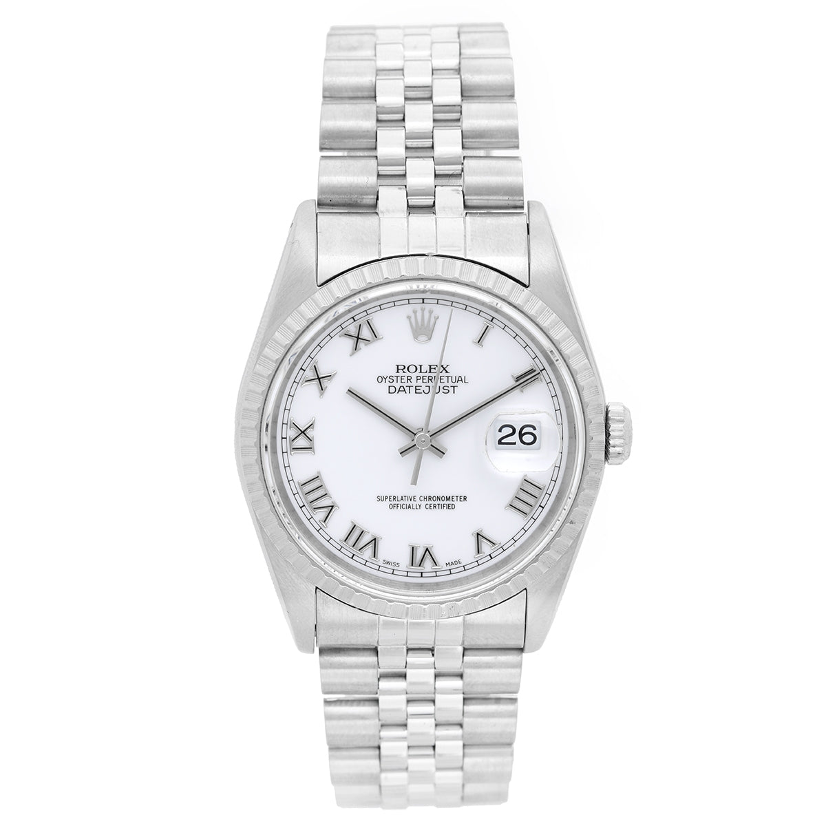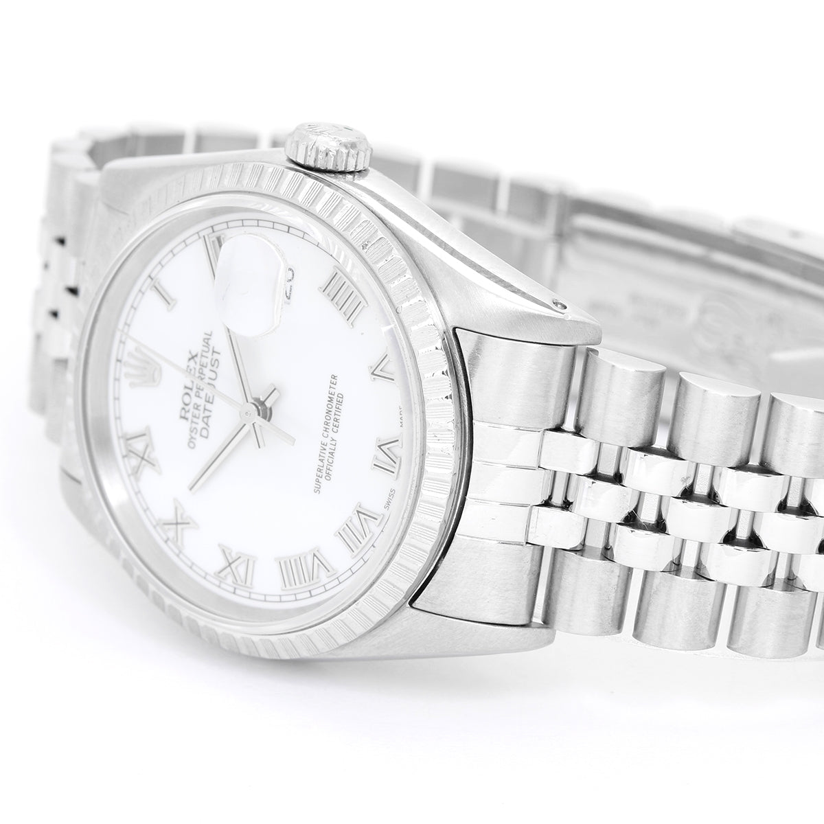 Rolex Datejust Men's Stainless Steel Watch 16220 - Automatic winding, 31 jewels, Quickset, sapphire crystal. Stainless steel case with engine turned bezel (36mm diameter). White dial with Roman numerals. Stainless steel Jubilee bracelet. Pre-owned with box.