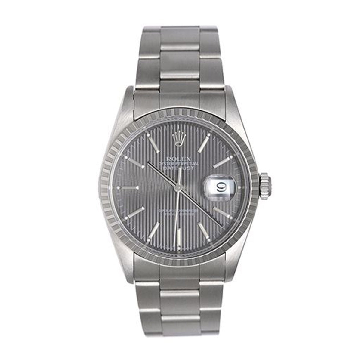Rolex Datejust, Model 16220 - Men's automatic winding wristwatch with date. Stainless steel case with engine turned bezel (36mm diameter). Gray tapestry dial with stick markers. Stainless steel Oyster bracelet. Pre-owned with custom box.