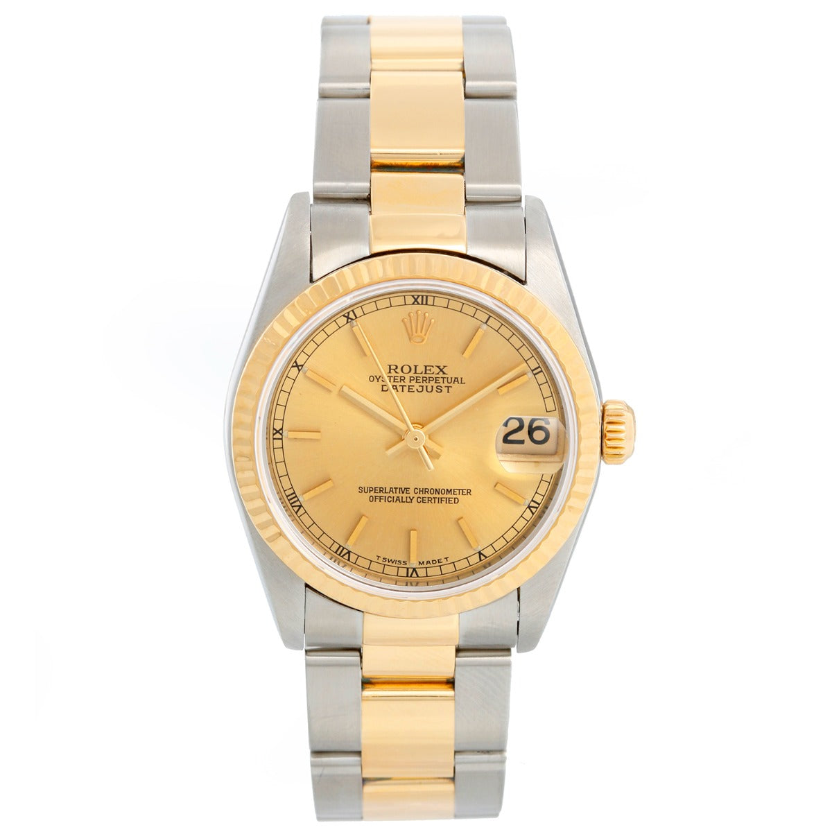 Rolex Datejust Midsize 2-Tone Men's or Ladies Watch 78273 - Automatic winding, 31 jewels, Quickset, sapphire crystal. Stainless steel case with yellow gold fluted bezel ( 31 mm ) . Champagne dial with stick hour markers. Stainless steel and 18k yellow gold Oyster bracelet. Pre-owned with custom box.