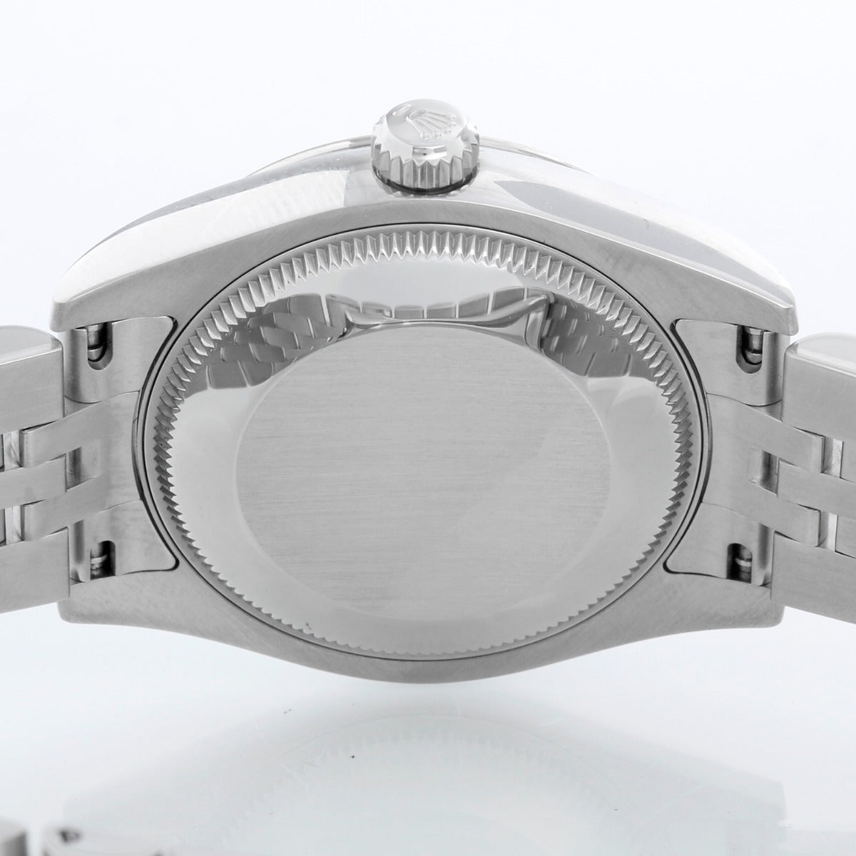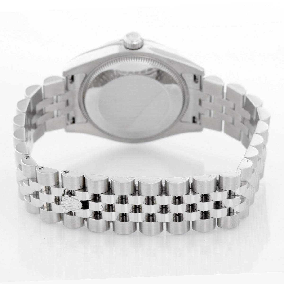 Rolex Datejust Midsize Men's or Ladies Steel Watch 178274 - Automatic winding; 31 jewel; sapphire crystal. Stainless steel case with 18k white gold fluted bezel (31mm diameter). Blue dial with stick hour markers . Stainless steel hidden-clasp Jubilee bracelet. Pre-owned with custom box