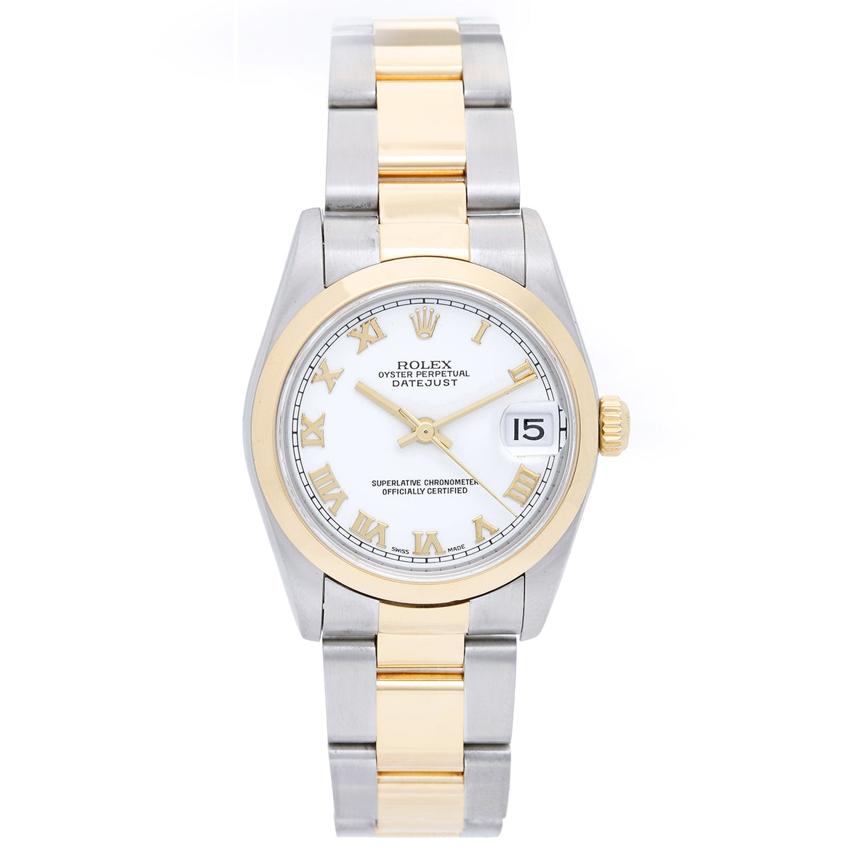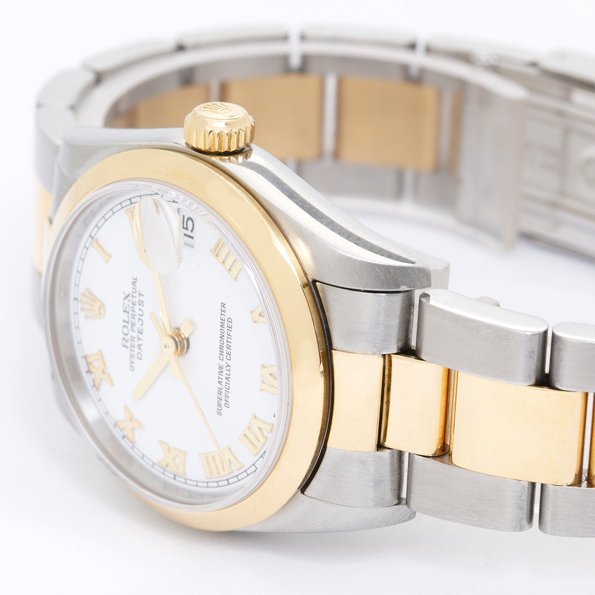 Rolex Datejust Midsize, 78243 - Men's or ladies midsize automatic winding wristwatch. Stainless steel case with 18k yellow gold smooth bezel (31mm diameter). White dial with raised gold Roman numerals. Sapphire crystal. Stainless steel and 18k yellow gold Oyster bracelet with deployant clasp. Pre-owned with box and books.