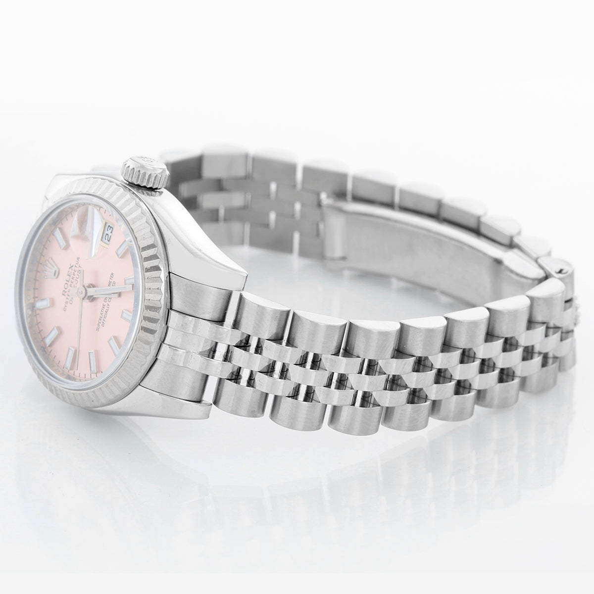 Rolex Ladies Datejust 179174 - Automatic winding wristwatch. Stainless steel case with 18k white gold Fluted bezel (26mm diameter) Pink dial with luminous stick markers. Stainless steel hidden-clasp Jubilee bracelet. Pre-owned with custom box
