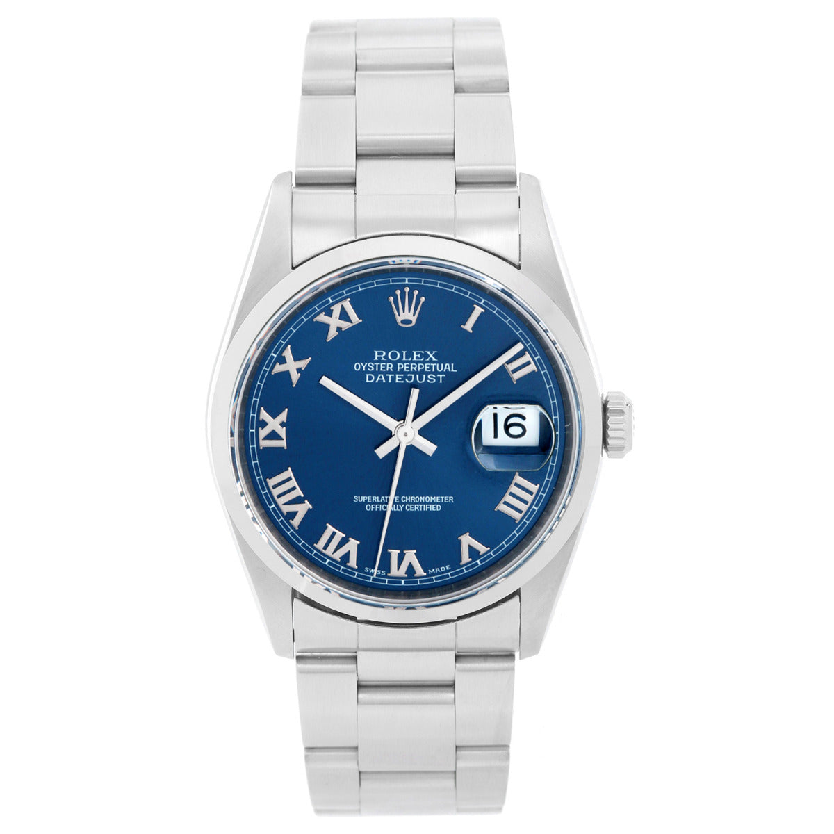 Rolex Datejust - Model 16200, Men's automatic winding wristwatch. Stainless steel case with smooth bezel (36mm diameter). Sapphire crystal. Blue dial with Roman numerals. Stainless steel Oyster bracelet. Pre-owned with custom box.