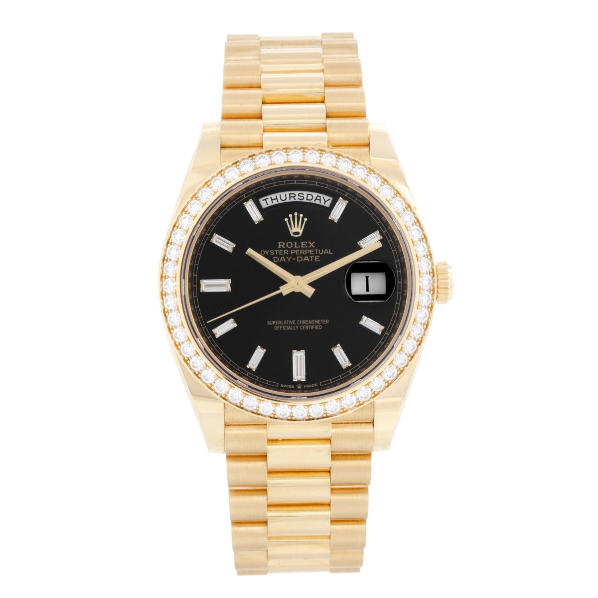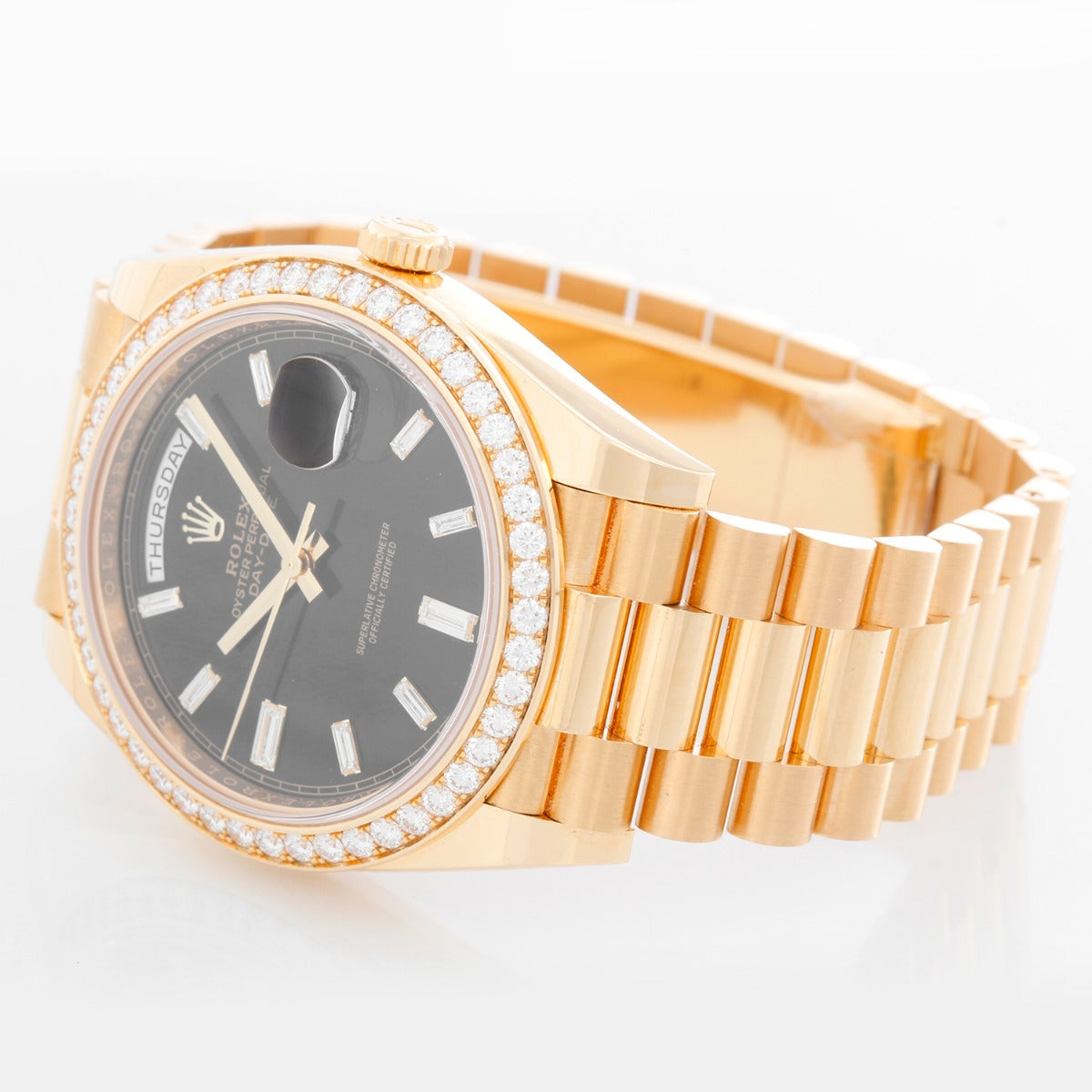 Rolex Day-Date II President 18k Yellow Gold Men's 40mm Watch 2282348 RBR - Automatic winding, 31 jewels, sapphire crystal, with day and date. 18K Yellow gold; diamond bezel (40mm diameter). Black dial with baguette hour markers.. 18k yellow gold President bracelet. Pre-owned with Rolex box and card.