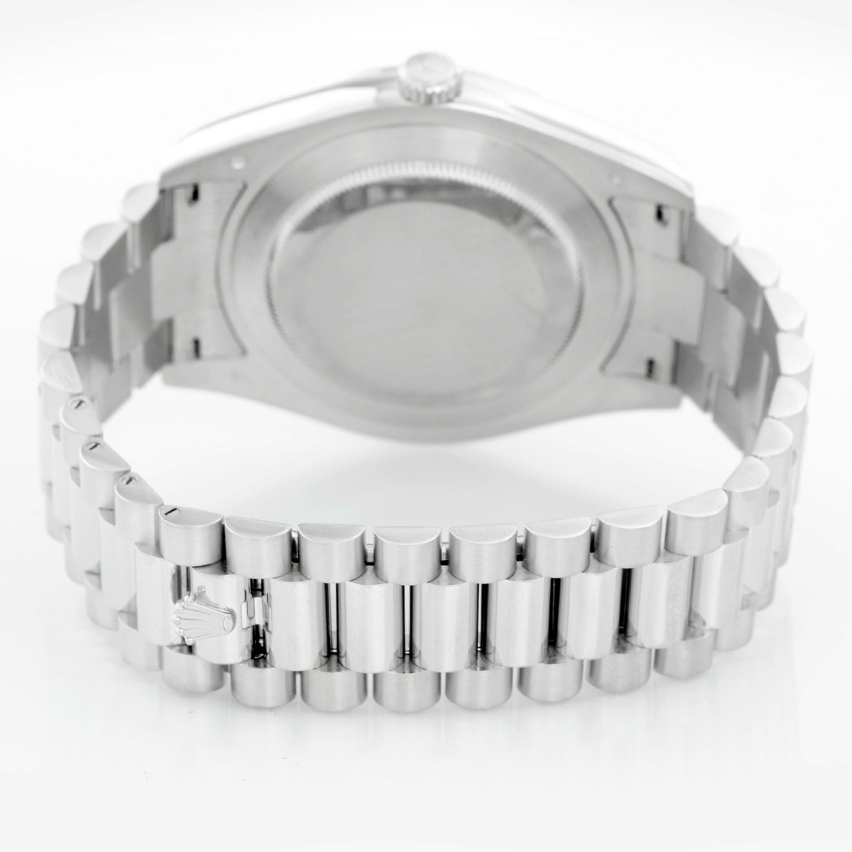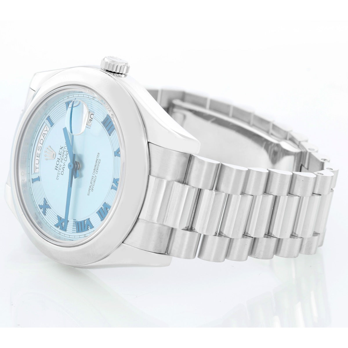 Rolex Day-Date II President Men's Platinum Watch Glacier Blue Dial 218206 - Automatic winding with day and date; 31 jewels; sapphire crystal. Platinum case with smooth bezel (41mm diameter). Glacier blue dial with Roman numerals. Platinum President bracelet. Pre-owned with Rolex box and books.