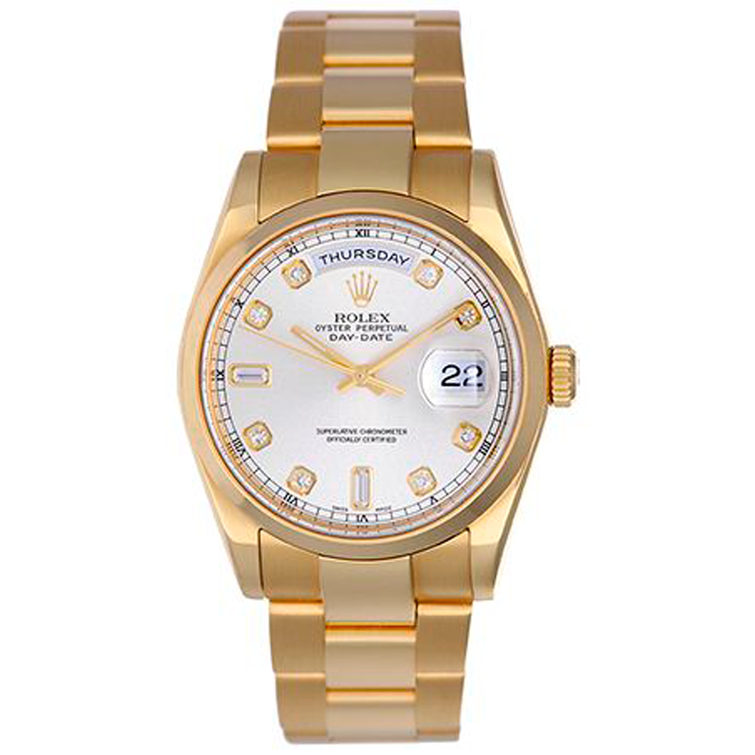 Rolex President Model 118208, Day-Date - Men's automatic winding wristwatch 18k yellow gold case with fluted bezel (36mm diameter). Silver dial with factory diamond hour markers. 18k yellow gold Oyster bracelet. Pr-owned with box and books.