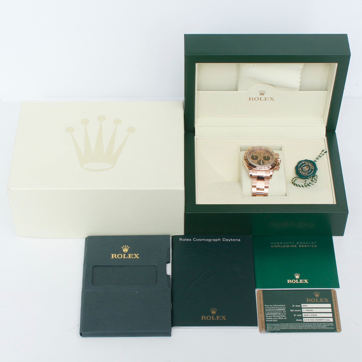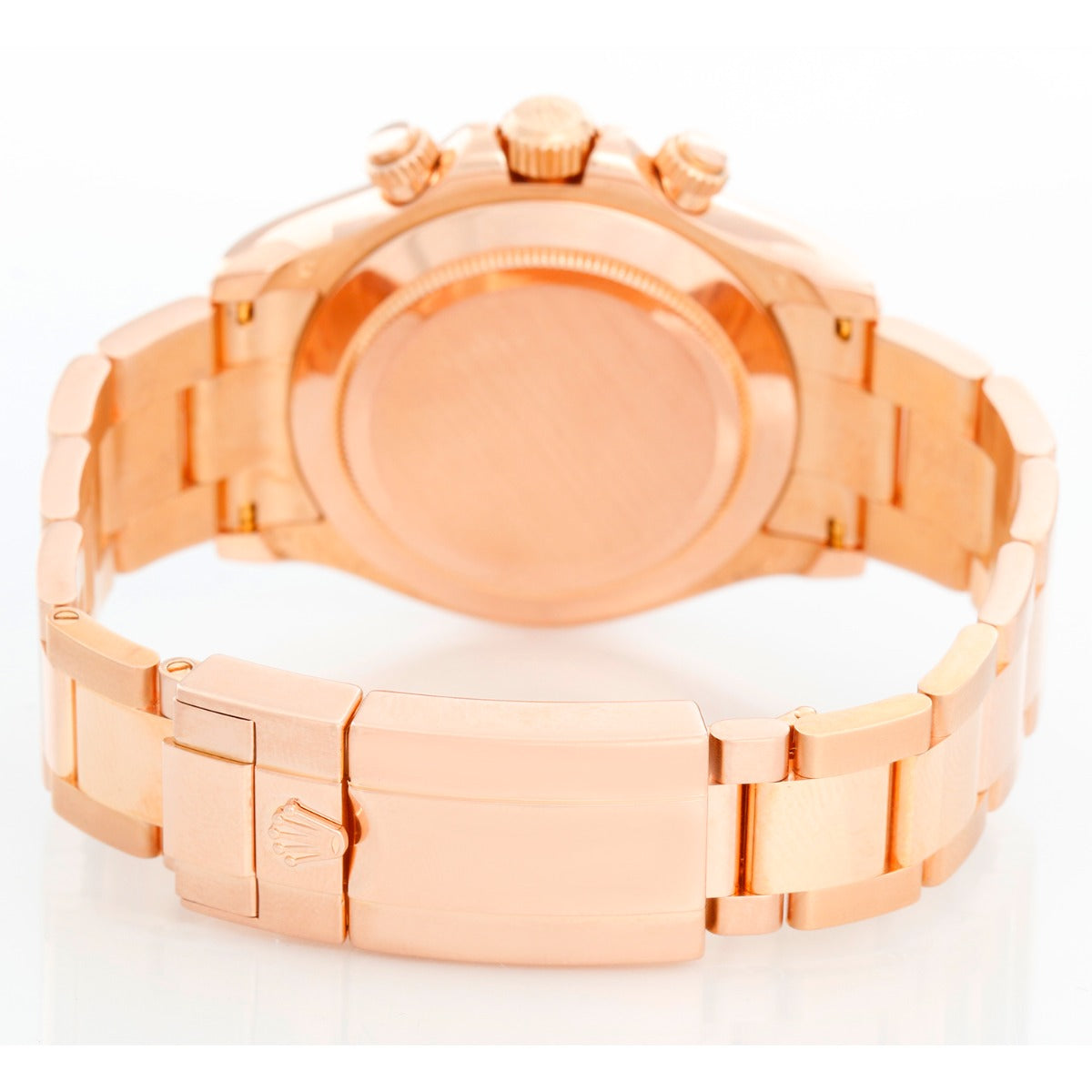 Rolex Everose Cosmograph Daytona Men's Rose Gold Watch Sundust Dial With Black Sub dials 116505 - Automatic winding, 44 jewel chronometer, chronograph. 18k rose gold case with tachymeter engraved bezel (40mm diameter). sundust gold dial with raised baton hour markers and black sub dials. 18k rose gold Oyster bracelet with flip-lock clasp. Pre-owned with Rolex box, books and open undated card.